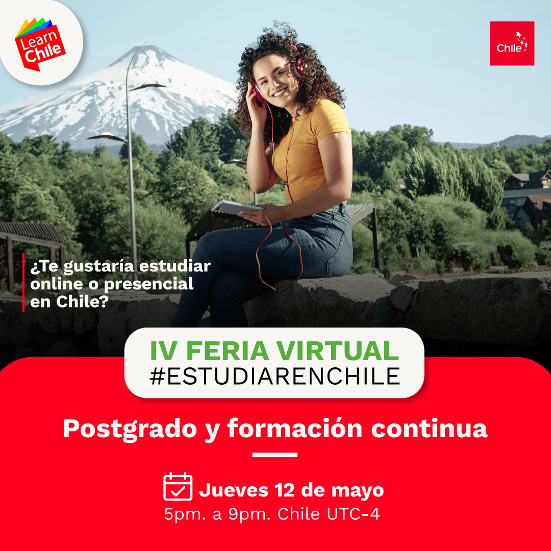 ¿La estabas esperando? Prepárate, el 12 de mayo, de 5 pm a 9 pm, tendrá lugar la IV Feria Virtual Estudiar en Chile: postgrado y formación continua, donde podrás conversar (chat o videollamada) con representantes de 25 universidades e institutos profesionales del país para planificar tu próxima especialización en Chile. Este año, además, podrás asistir a charlas para conocer las oportunidades y beneficios que ofrece el país a estudiantes latinoamericanos y los últimos avances en ciencia e innovación de nuestras instituciones.