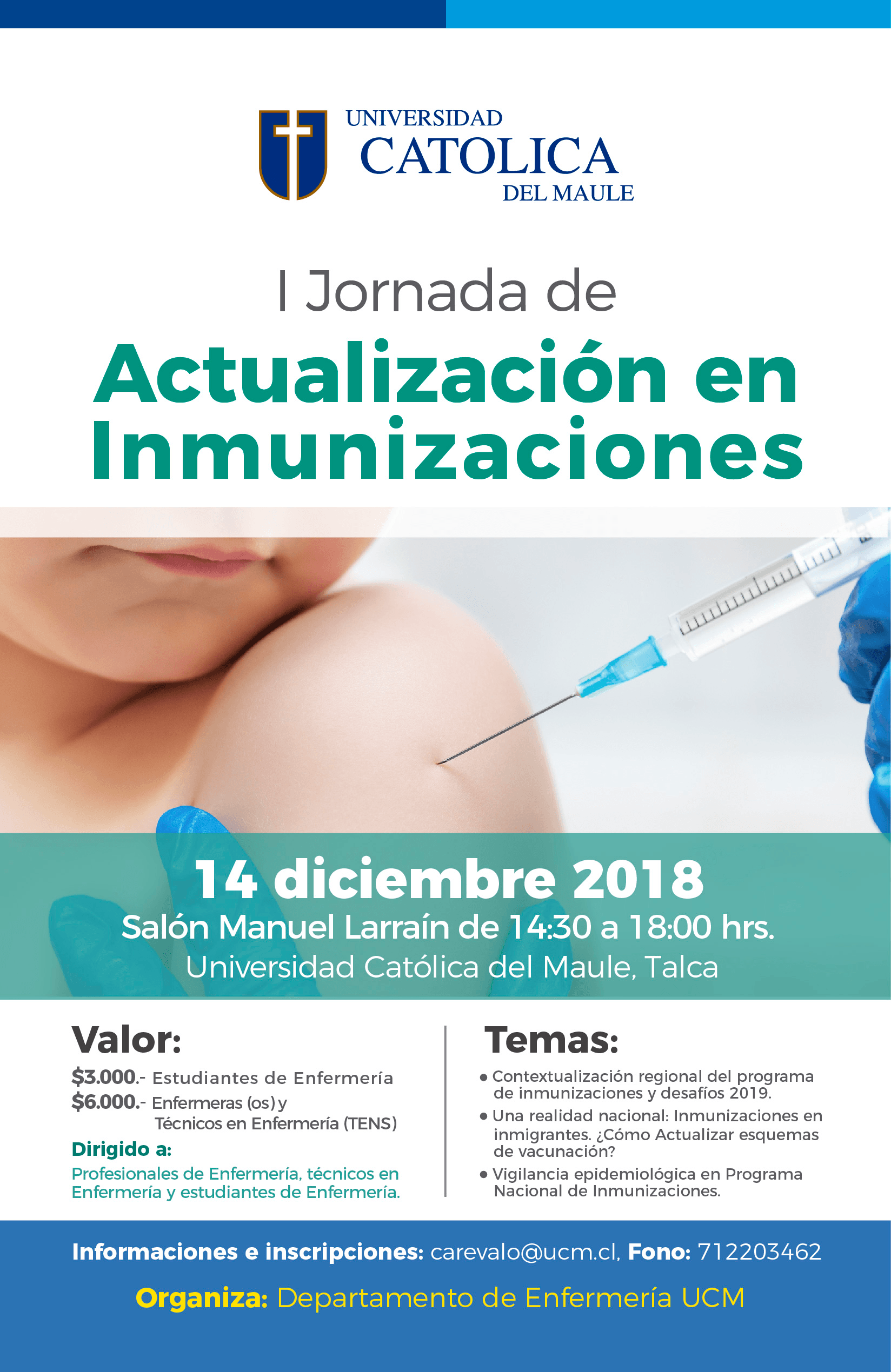 Con precios acotados, 3 mil pesos para estudiantes y 6 mil pesos para profesionales, se realizará el viernes 14 de diciembre en el salón Monseñor Manuel Larraín la I Jornada de Actualización en Inmunizaciones, actividad organizada por el Departamento de Enfermería de la Facultad de Ciencias de la Salud de la Universidad Católica del Maule.