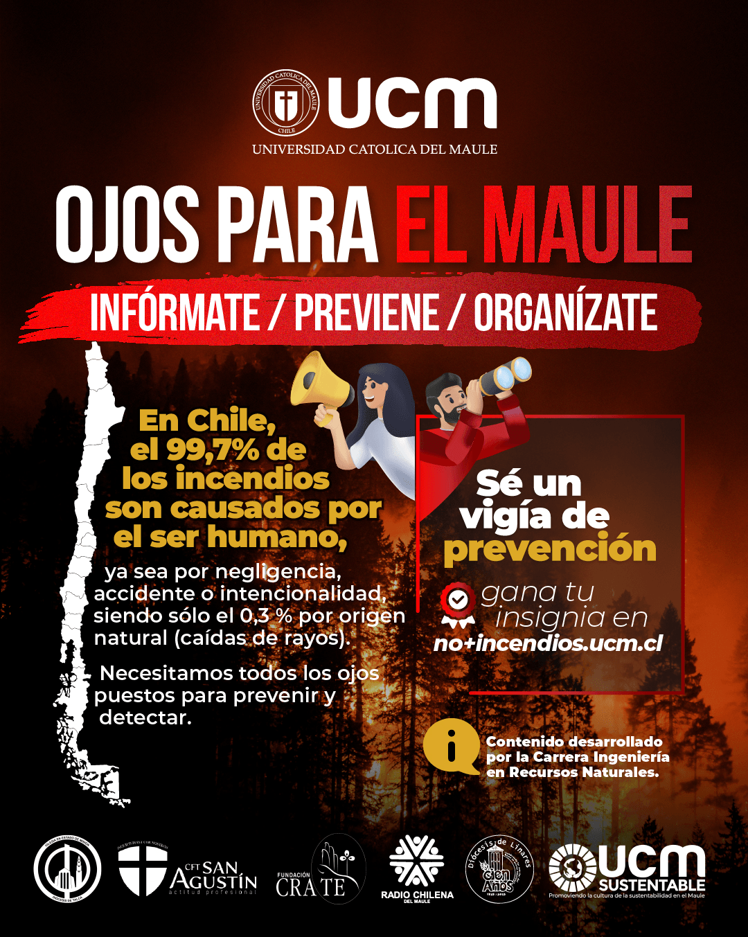 La Universidad Católica del Maule (UCM) se encuentra liderando la campaña “Ojos para el Maule”, a través de la Facultad de Ciencias Agrarias y Forestales y el proyecto UCM Sustentable, dando la posibilidad a las personas para certificarse como vigías en la prevención de incendios forestales.