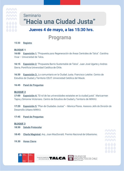 Con la presencia del premio nacional de Urbanismo, Joan McDonald, se realizó el seminario "Hacia una Ciudad Justa", organizado por el Ministerio de Vivienda y Urbanismo. Entre sus expositores estuvo el académico de la Universidad Católica del Maule (UCM) y director de la Escuela de Sociología, Dr. Francisco Letelier.