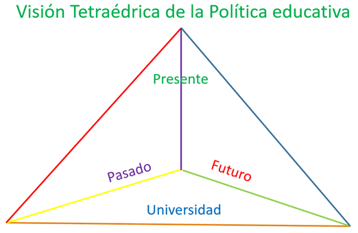 La Visión Tetraédrica de la Política Educativa es una oportunidad definida por sus fuerzas que desafía a las instituciones de educación superior a confluir en nuevas y abiertas estrategias de admisión y egreso, trabajando en los extremos de la cadena de valor, sin perder la atención en el proceso mismo, es decir, las tres fuerzas temporales: Futuro, Presente y Pasado.