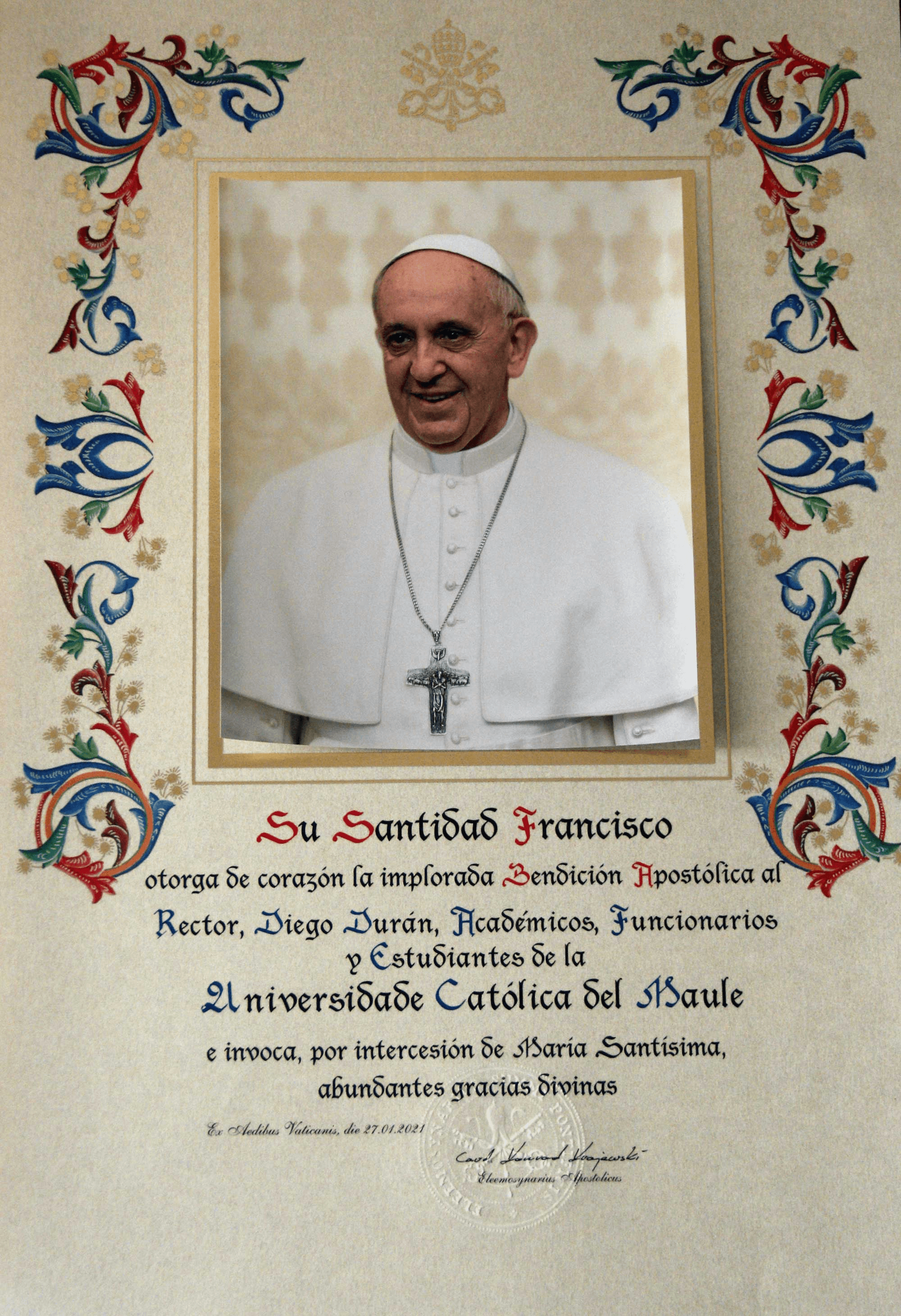 “Su Santidad Francisco otorga de corazón la implorada Bendición Apostólica al Rector, Diego Durán, académicos, funcionarios y estudiantes de la Universidad Católica del Maule e invoca, por intercesión de María Santísima, abundantes gracias divinas” fue el mensaje que compartió el Papa Francisco a la comunidad de la UCM.