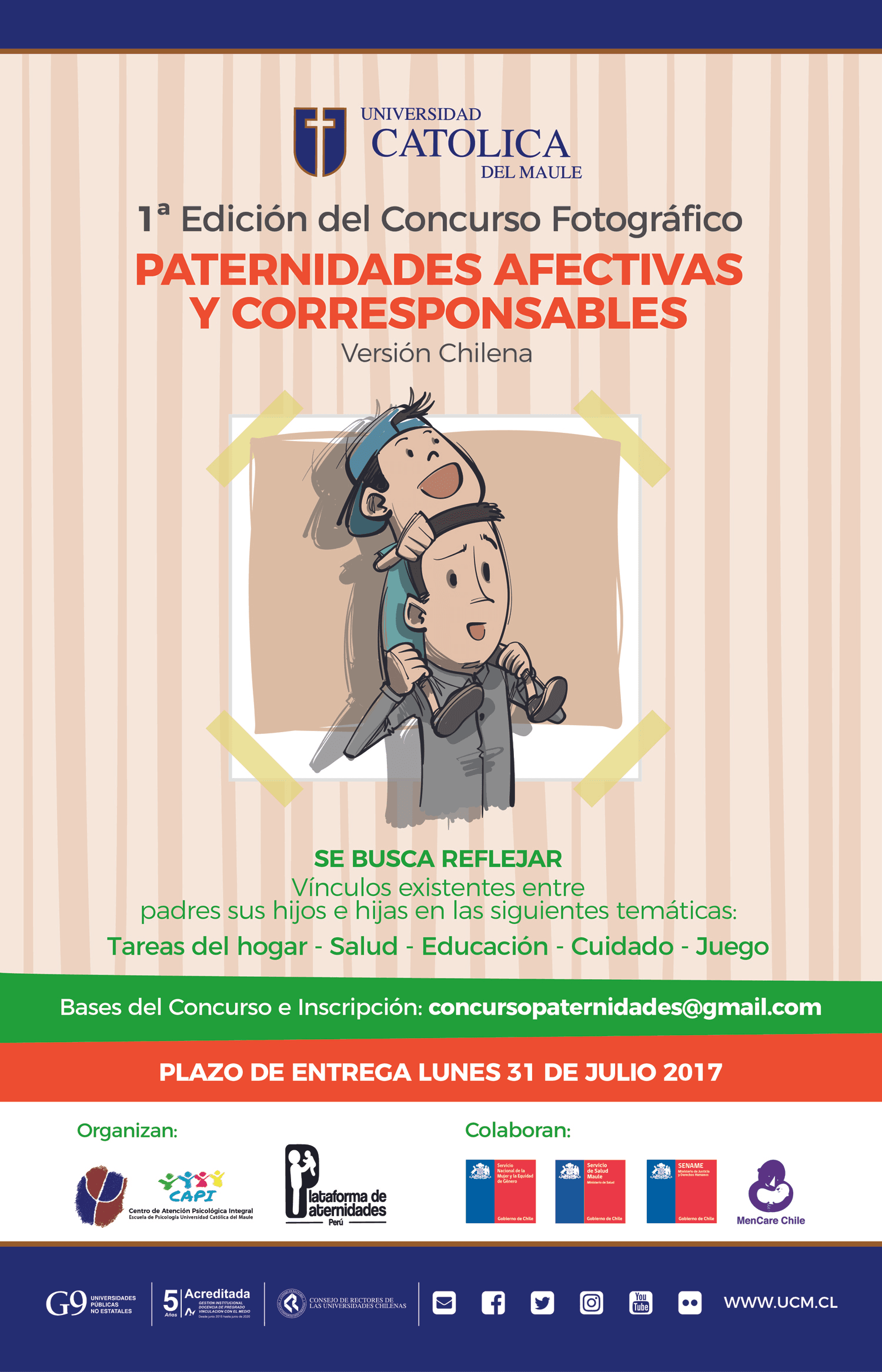 El Centro de Atención Psicológica Integral (CAPI), perteneciente a la Escuela de Psicología de la Universidad Católica del Maule (UCM), organiza el primer concurso fotográfico: “paternidades afectivas y corresponsables”, idea que surge tras la vinculación que mantienen con la Plataforma de Paternidades de Perú, organismo que ya ha desarrollado cinco versiones en su país.