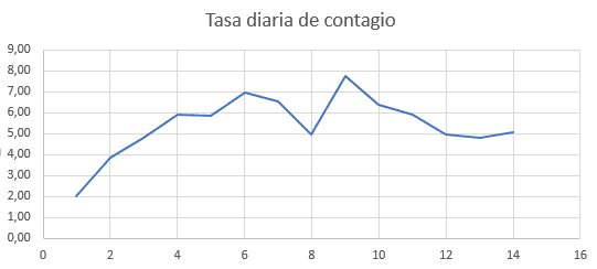 Obsérvese que con una tasa constante ya existe un crecimiento exponencial, acá en el periodo observado al menos hemos duplicado esta tasa. En teoría, el mantener un esfuerzo de mitigación se debería reflejar en una tasa a la baja hacia una tendencia constante (al menos en este corto periodo de tiempo). El duplicar la tasa, es pasar al primer día tener el doble de casos, el segundo cuatro veces más, el tercero 8 veces más y así cada día tantas veces más según potencias de dos, respecto de lo que se habría tenido con una tasa constante que ya era un crecimiento exponencial. La conclusión es que aquí se ha actuado en contrario a las medidas de intervención.