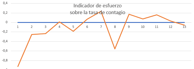 Una manera de entender el esfuerzo diario es aislar el efecto exponencial y solo hacer la gráfica de la variabilidad relativa de esta, que se ilustra en la figura 2. En que los valores negativos son muy probablemente reflejo (con un desfase temporal) de relajo y los positivos adición o reactivación de esfuerzos.