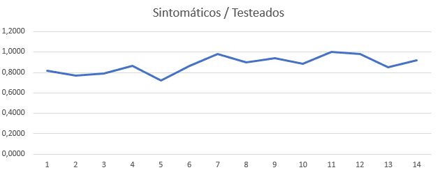 Respecto a la existencia de un grupo asintomático y que marcará como tal al momento de una prueba PCR, es una condición bastante intrínseca, que existiendo factores ambientales, alimenticios que la hagan variar, en un periodo de 15 días es suficientemente rígida, por lo tanto su presencia porcentual en la población no debería variar. En otras palabras, de existir suficientes test el porcentaje de activos sintomáticos (el complemento) debiera marcar un porcentaje determinado. La figura 3 representa el cuociente de los sintomáticos entre los positivos testados. Los valores están entre 72% al 100%, esto es, todavía un margen de 28% que es una variabilidad por rango demasiado amplia. La explicación más probable es un número de pruebas es insuficiente.