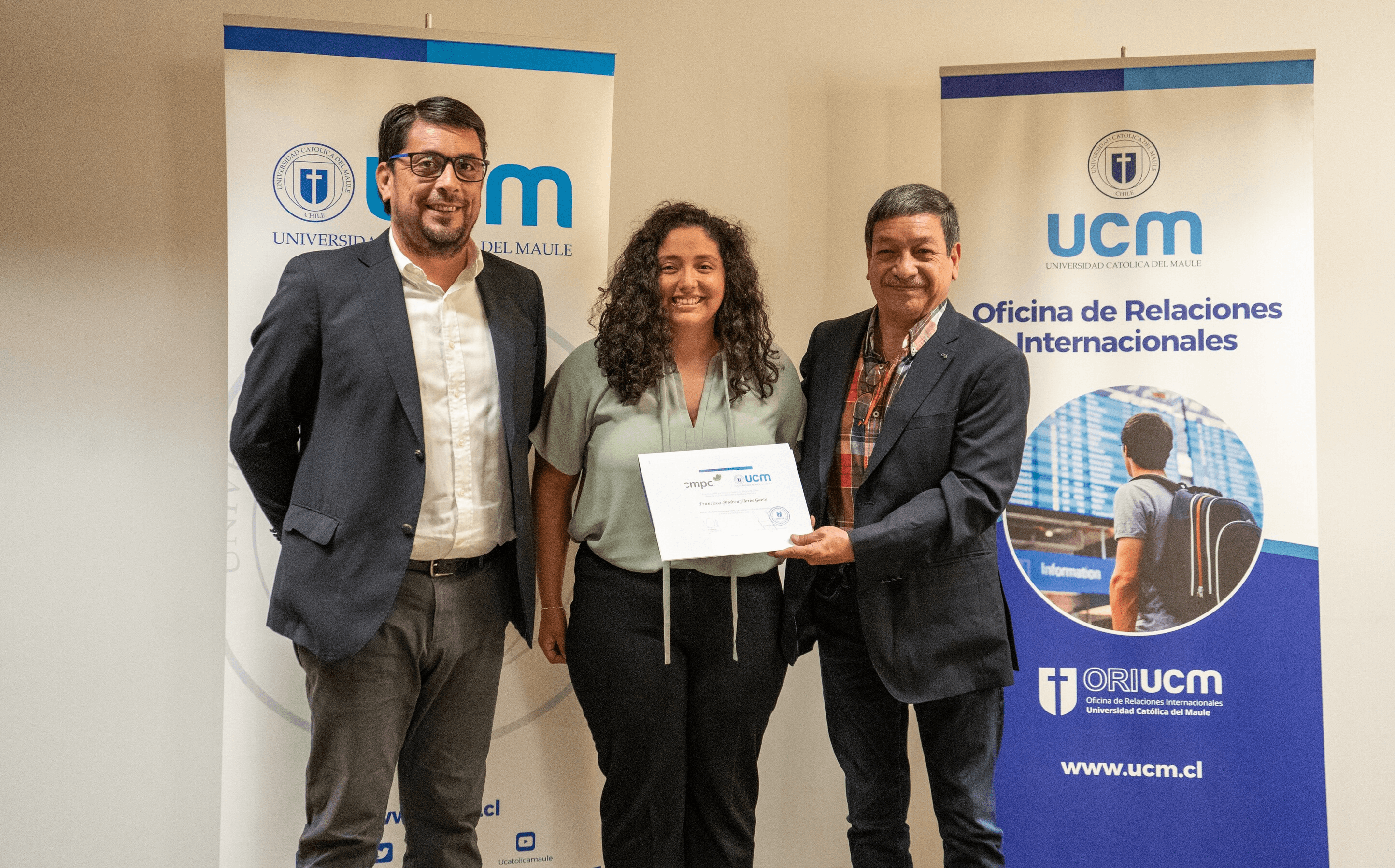 La otra beneficiada, Marcela Paz Ríos, a través de una carta, que fue leída por su padre, le agradeció a su familia por la formación y valores que le han entregado y luego tuvo palabras de agradecimientos para su casa de estudios. “Agradezco a la UCM y sus docentes que han creído en mí, que han impulsado y potenciado mis saberes, sentando así las bases de este gran proyecto que es este intercambio”, sostuvo.