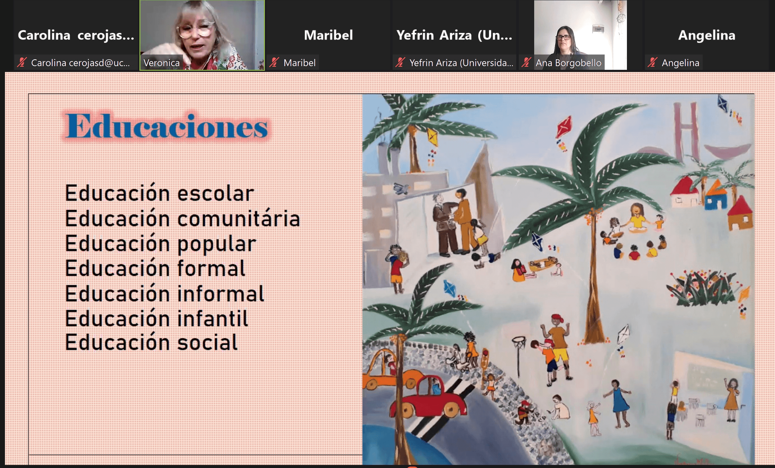 La actividad académica comenzó con la conferencia de la dra. Verónica Muller, presidenta de la Asociación de Educadores Sociales de Maringá, Brasil, quién abordó el tema: Demandas para las educaciones en cuarentena: Travesías.