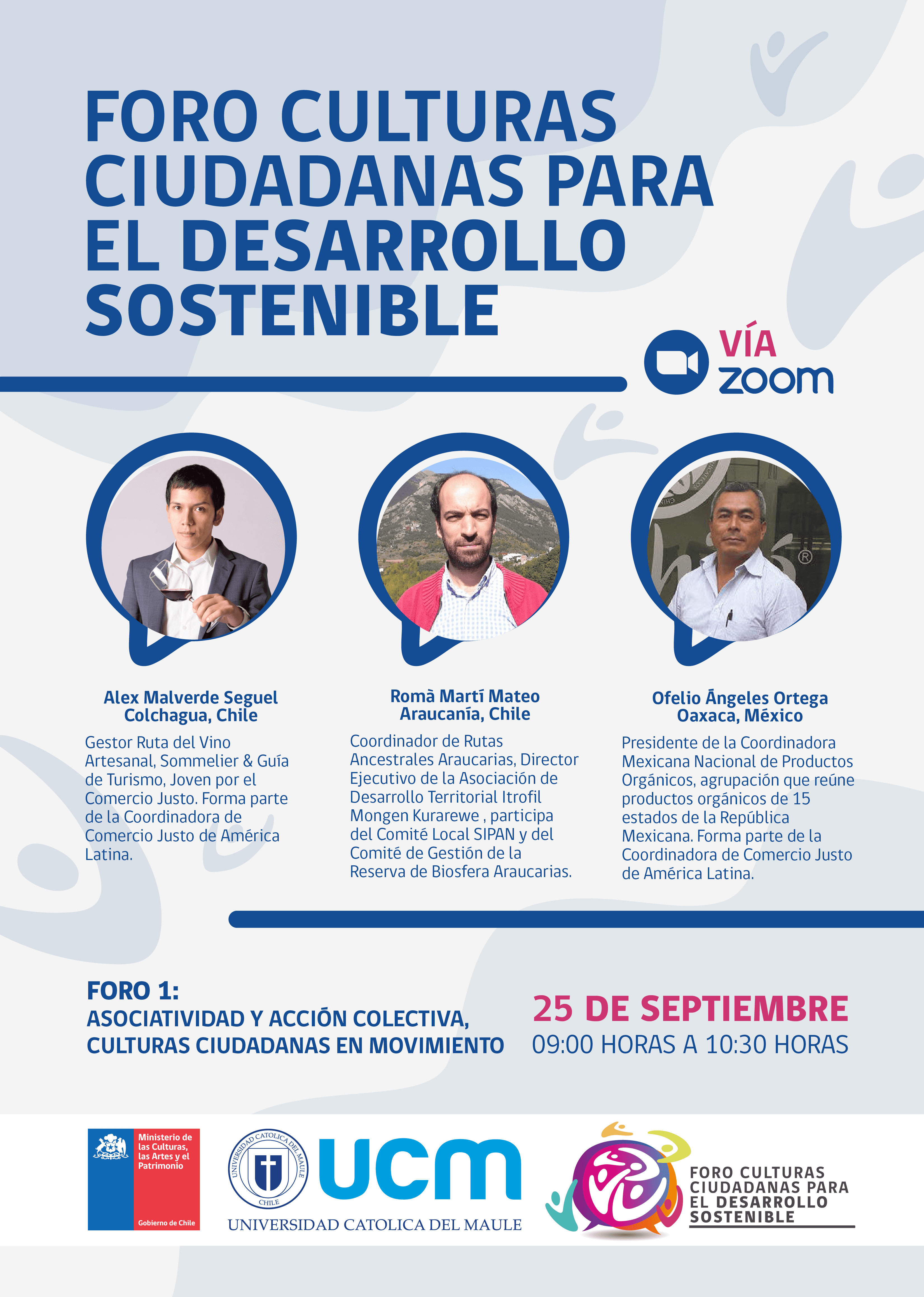 Abierta se encuentra la invitación para participar de los foros fijados para lo que queda del año, los que se realizan a través de las plataformas Zoom, Facebook y Youtube, siendo la próxima fecha el 25 de septiembre entre las 09:00 y las 10:30 horas con el tema “Asociatividad y Acción Colectiva, Culturas Ciudadanas en Movimiento”, junto a los panelistas Alex Malverde Seguel, gestor de la Ruta del Vino de Colchagua, Roma Martí Mateo, coordinador de Rutas Ancestrales Araucarias y director Ejecutivo de la Asociación de Desarrollo Territorial Itrofil Mongen Kurarewe, y Ofelio Angeles Ortega, presidente de la Coordinadora Mexicana Nacional de Productos Orgánicos, agrupación que reúne a productores orgánicos de 15 estados de México.