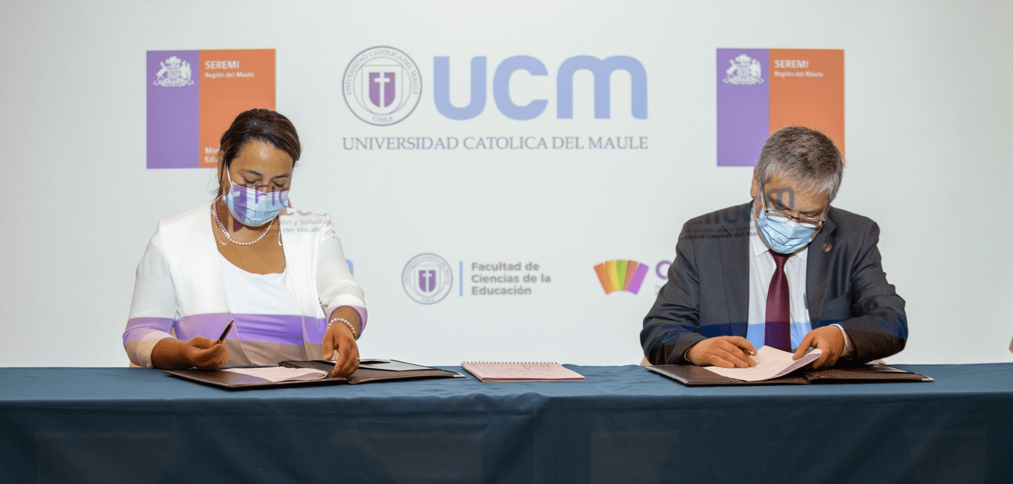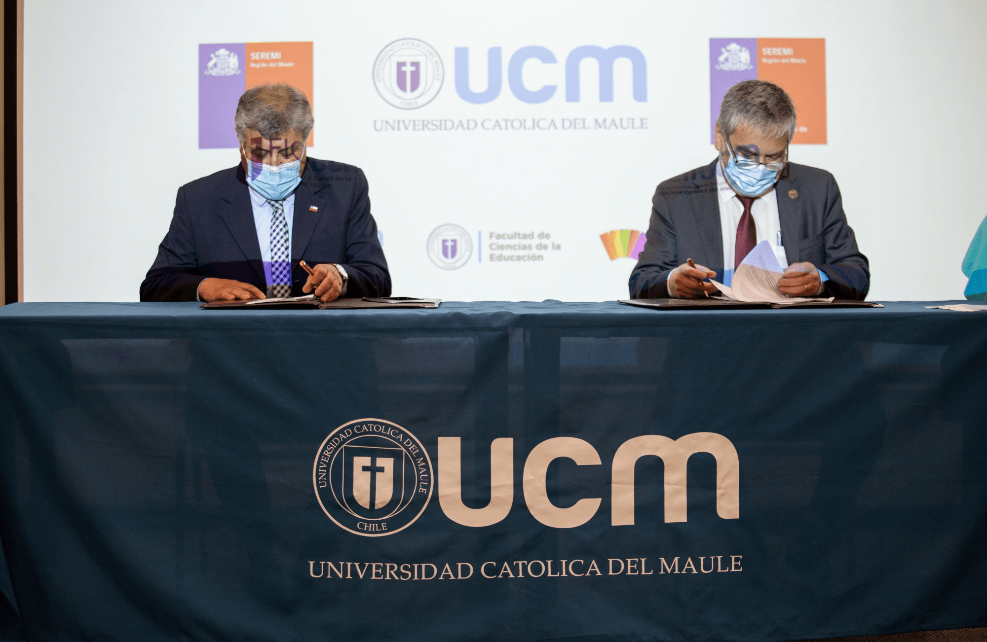 Con la asistencia de la Seremi de Salud, Dra. Marlenne Durán, el Seremi de Educación, profesor Carlos Azócar, el rector de la Universidad Católica del Maule, el Dr. Diego Durán y la directora del Centro de Estudios para la Inclusión Intercultural, Dra. Myriam Díaz, se realizó con éxito la firma de contratos de licencia no comercial entre la Universidad Católica del Maule y ambas Secretarías Ministeriales.