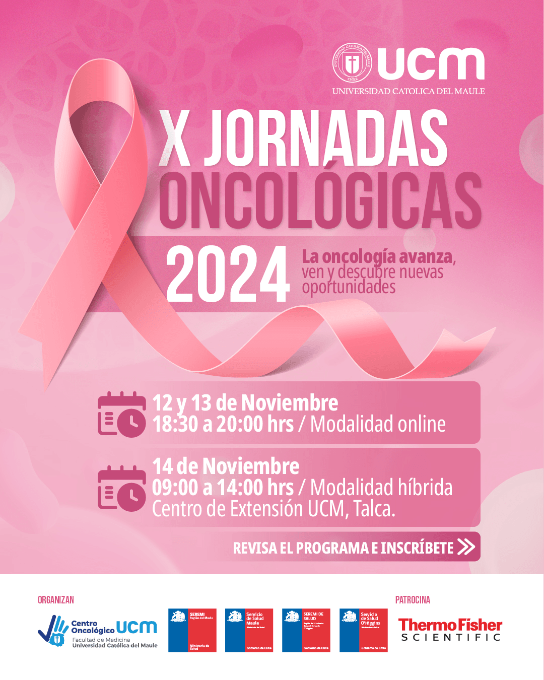 En su décima versión, las Jornadas Oncológicas, organizadas por el Centro Oncológico de la Universidad Católica del Maule (UCM) junto con los Servicios de Salud y las Seremis de Salud del Maule y O’Higgins, regresan el próximo 12, 13 y 14 de noviembre con un enfoque renovado en los avances de diagnóstico y tratamiento en la lucha contra el cáncer. Bajo el lema “La oncología avanza, ven y descubre nuevas oportunidades”, el evento, que tendrá lugar en modalidad online y presencial en el Centro de Extensión de la UCM en Talca, buscará reunir a profesionales de salud, académicos y autoridades para un intercambio de conocimientos y la promoción de prácticas clínicas innovadoras y accesibles en oncología.