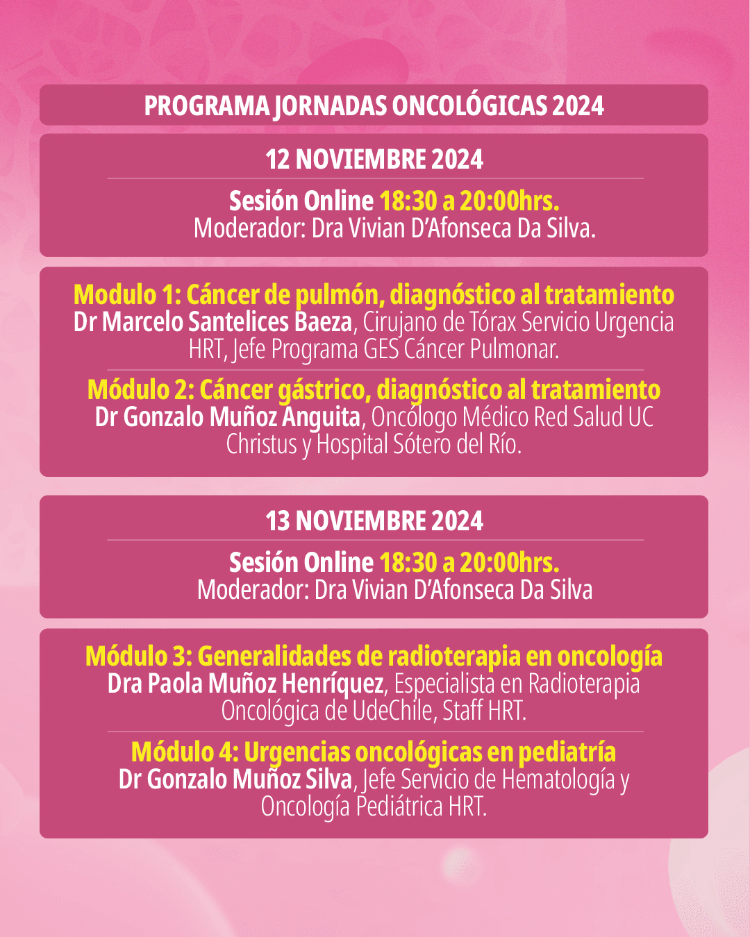 Las exposiciones serán encabezadas por especialistas de renombre en el área oncológica, incluyendo al Dr. Marcelo Santelices Baeza, experto en cirugía torácica; la Dra. Paola Muñoz Henríquez, reconocida especialista en radioterapia; y el Dr. Sung Kim, jefe de la Agencia Nacional de Prevención y Control del Cáncer, quien expondrá sobre los avances y desafíos del Plan Nacional de Cáncer. Esta edición también destacará el papel de la tecnología, incluyendo innovaciones en secuenciación masiva presentadas por la especialista PhD Susana Rasmussen de Thermo Fisher Scientific, empresa patrocinadora del evento.