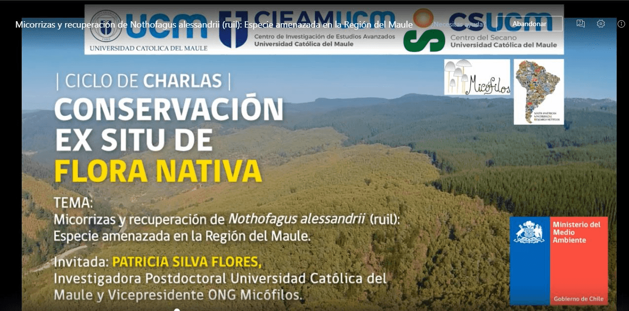"Micorrizas y recuperación de Nothofagus alessandrii (Ruil): Especie amenazada en la Región del Maule", fue la exposición de la Dra. Patricia Silva, quien agradeció la oportunidad de exponer su trabajo de investigación. Sobre la importancia de la actividad a la que fue invitada, la científica explicó que “Se enmarca en la realización de un ciclo de charlas del Programa Nacional de Conservación ex situ de Flora Nativa, en el que se abordaron distintos temas relevantes para la conservación ex situ de plantas, pasando por las instituciones que la practican y los temas de investigación de en dichas instituciones se desarrollan”.