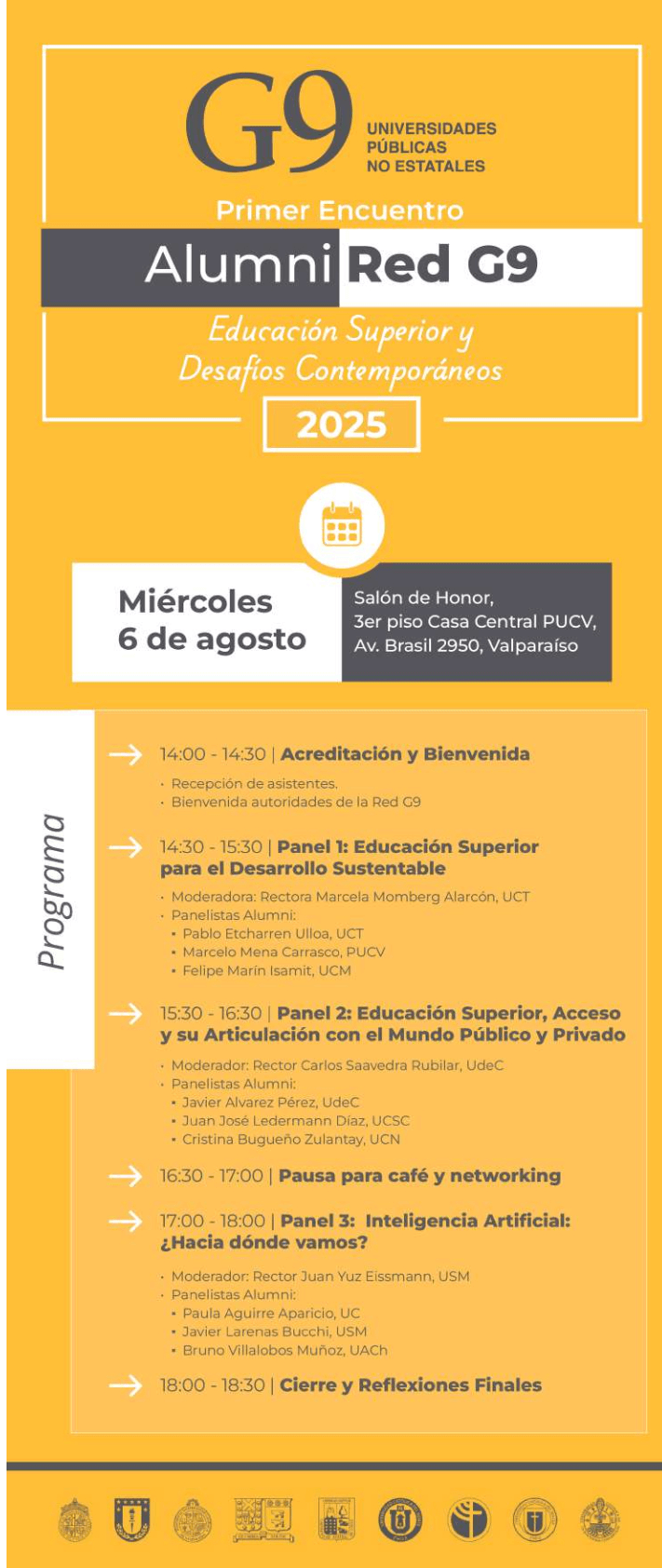 La Red de Universidades Públicas No Estatales de Chile Red G9, invita cordialmente a su comunidad a participar del Primer Encuentro de Alumni "Educación Superior y Desafíos Contemporáneos", que se realizará el miércoles 6 de agosto, desde las 14:00 horas, en el Salón de Honor de la Casa Central de la Pontificia Universidad Católica de Valparaíso (Avenida Brasil 2950, Valparaíso).