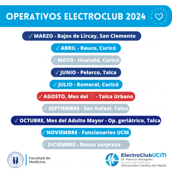 Durante el año 2024, la Facultad de Medicina de la Universidad Católica del Maule (UCM) continuará apoyando al ElectroClub, el cual tiene como objetivo potenciar el aprendizaje respecto a electrocardiografía en sus estudiantes, y la vez brindar un servicio a la comunidad, traducido en la realización e informes de electrocardiogramas, aportando con ello a la salud regional.