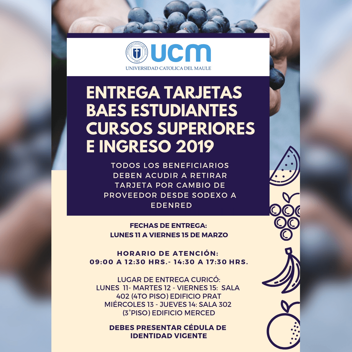 Desde el lunes 11 al viernes 15 cada estudiante podrá retirar la tarjeta presentando su cédula de identidad en horario de 09:00 a 12:30 y de 14:30 a 17:30 horas, en las sedes de la Universidad Católica del Maule de Talca -2do piso edificio de Aprendizaje Autónomo del Campus San Miguel- y Curicó -11, 12 y 15 de marzo en el 4to piso edificio Prat. y el 13 y 14 de marzo en la sala 302 ubicada en el 3er piso del edificio Merced-.