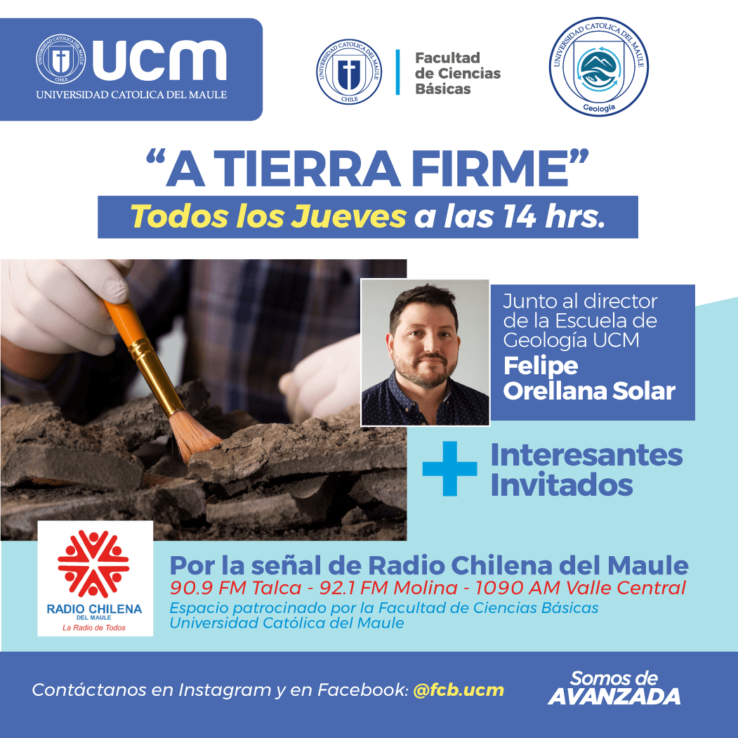 “A Tierra Firme” es el nuevo espacio de conversación que cada jueves a las 14:00 horas brinda a la comunidad la Escuela de Geología de la Facultad de Ciencias Básicas de nuestra Universidad por la señal de la Radio Chilena del Maule -90.9 FM Talca - 92.1 FM Molina - 1090 AM Valle Central-.