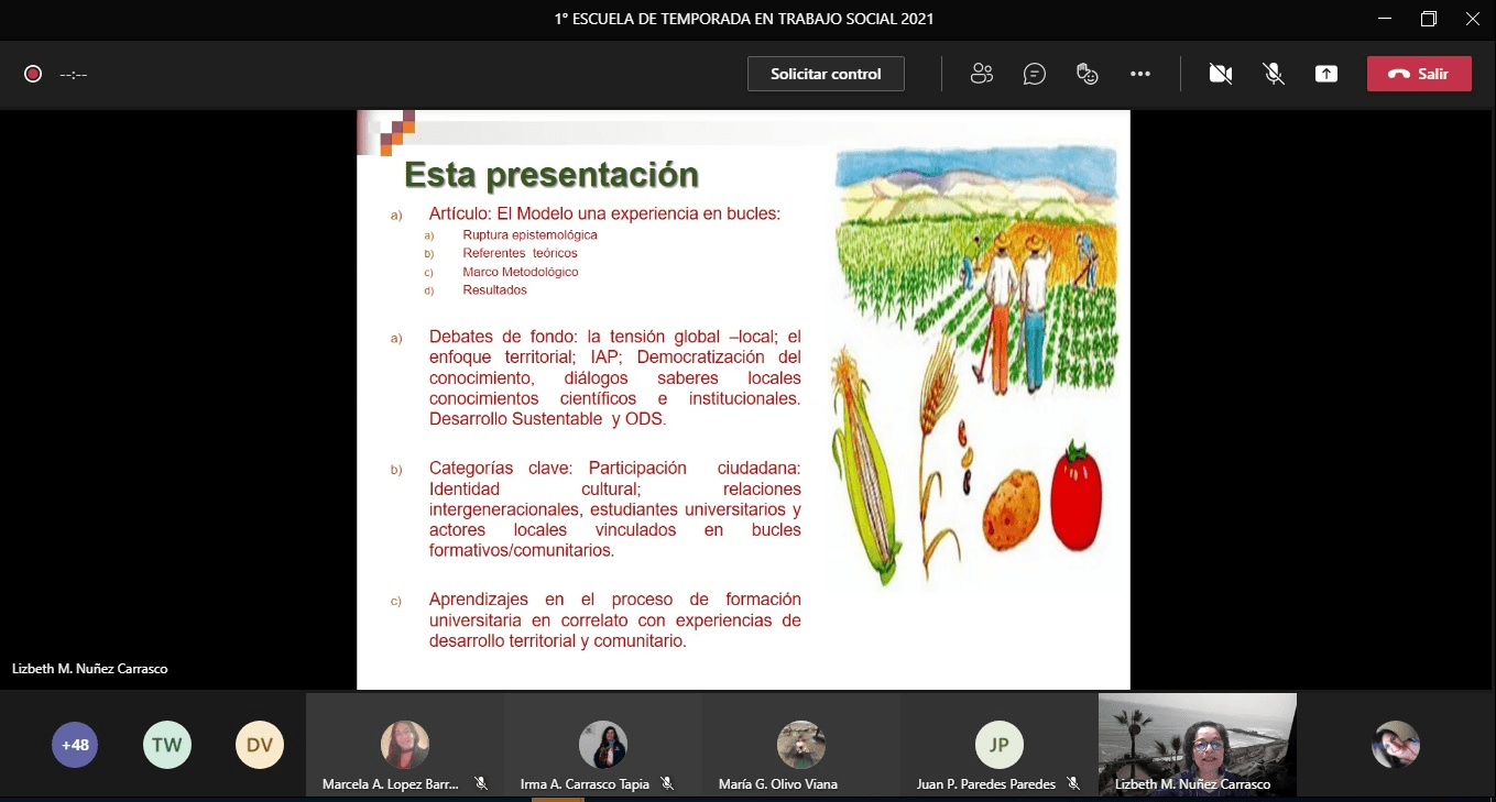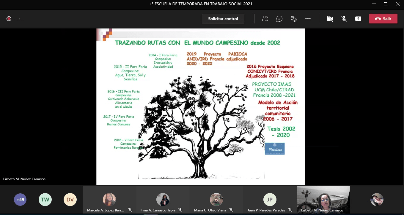 También participó de la instancia la académica de la Facultad Ciencias Sociales y Económicas, Lizbeth Núñez Carrasco. “Lo que expuse fue el material de un artículo publicado en la Revista Pensamiento y Acción Interdisciplinaria de la Escuela de Trabajo Social. Nos referimos al trabajo docente en el área del desarrollo territorial rural, exponiendo una metodología formativa y a la vez comunitaria, creada en co-construcción desde 2006 a 2017 cuando salió el primer borrador, que sometí a dos expertos internacionales, para sus juicios críticos. Lo presenté en Congresos Internacionales desde distintos énfasis y dimensiones”, dijo.
