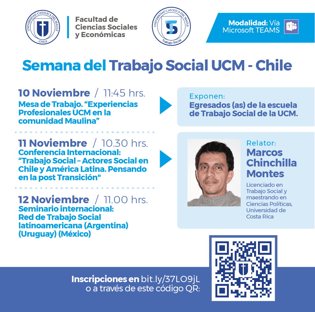 Luego el día Miércoles 11 de Noviembre, Día Oficial del Trabajador(a) Social en Chile, a las 10.30 horas, se desarrollará la conferencia “Trabajo Social – Actores Sociales En Chile Y América Latina. Pensando En La Post Transición", a través de la plataforma digital Microsoft Teams y contará con la presentación del reconocido académico Costarricense, Director del Boletín Latinoamericano “Sura” Sr. Marco Chinchilla Montes, de la Universidad de Costa Rica.
