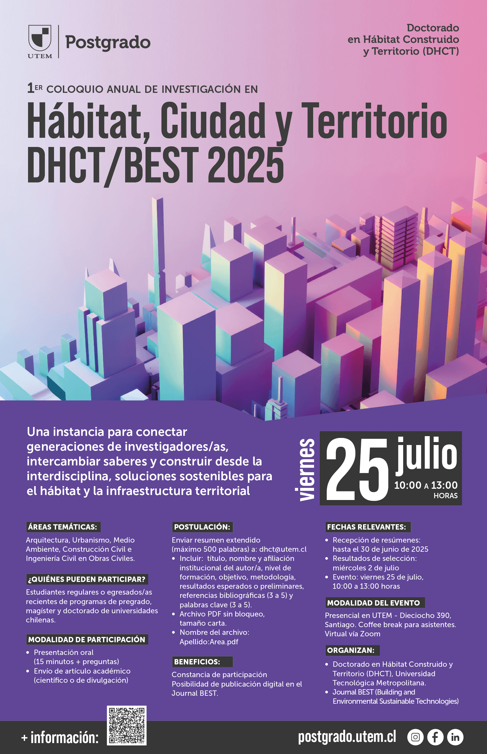 El evento se desarrolló el 25 de julio 2025 en dependencias de la Universidad Tecnológica Metropolitana (Santiago centro), y convocó a investigadoras e investigadores de distintas áreas vinculadas al hábitat, construcción, arquitectura, sustentabilidad y territorio.