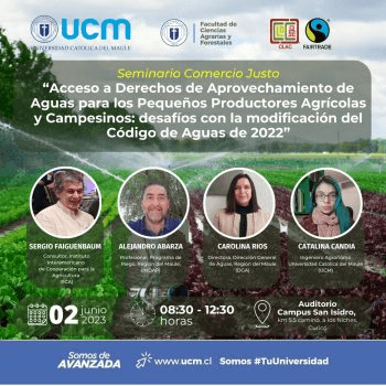 El seminario "Acceso a Derechos de Aprovechamiento de Aguas para los Pequeños Productores Agrícolas y Campesinos: desafíos con la modificación del Código de Aguas de 2022" se realizó en el marco del programa de vinculación con el medio "Comercio justo para el desarrollo rural: una contribución desde la docencia en la UCM".