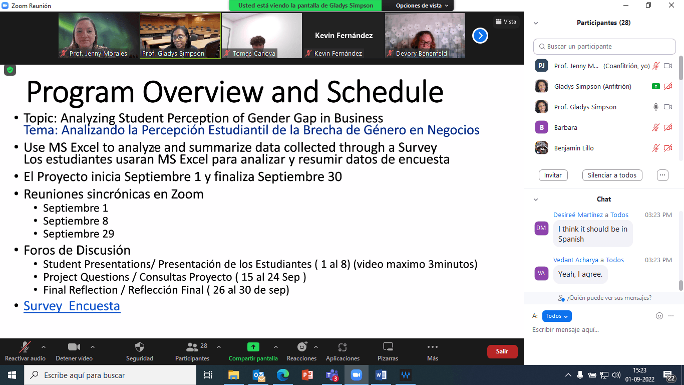 Durante el mes de septiembre, a través de este sistema, estudiantes de primer año de la Escuela de Contador Público y Auditor de la UCM, trabajaron con sus pares del College of Business de la Florida International University (FIU) de Miami, iniciativa que fue guiada por las profesoras Dra. Gladys Simpson de la FIU y Dra. Jenny Morales de la UCM.
