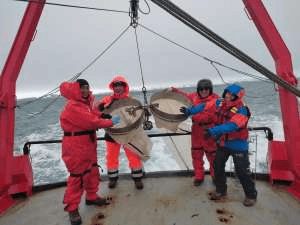 Las estudiantes de doctorado de la Universidad de Chile y del Instituto Milenio BASE, Valentina Bernal y Francisca Rodriguez, igualmente colectaron muestras de Harpagifer antarcticus pero en estado de larva y con el apoyo de una red bongo en la isla Greenwich, con el fin de llevar a cabo estudios genómicos.