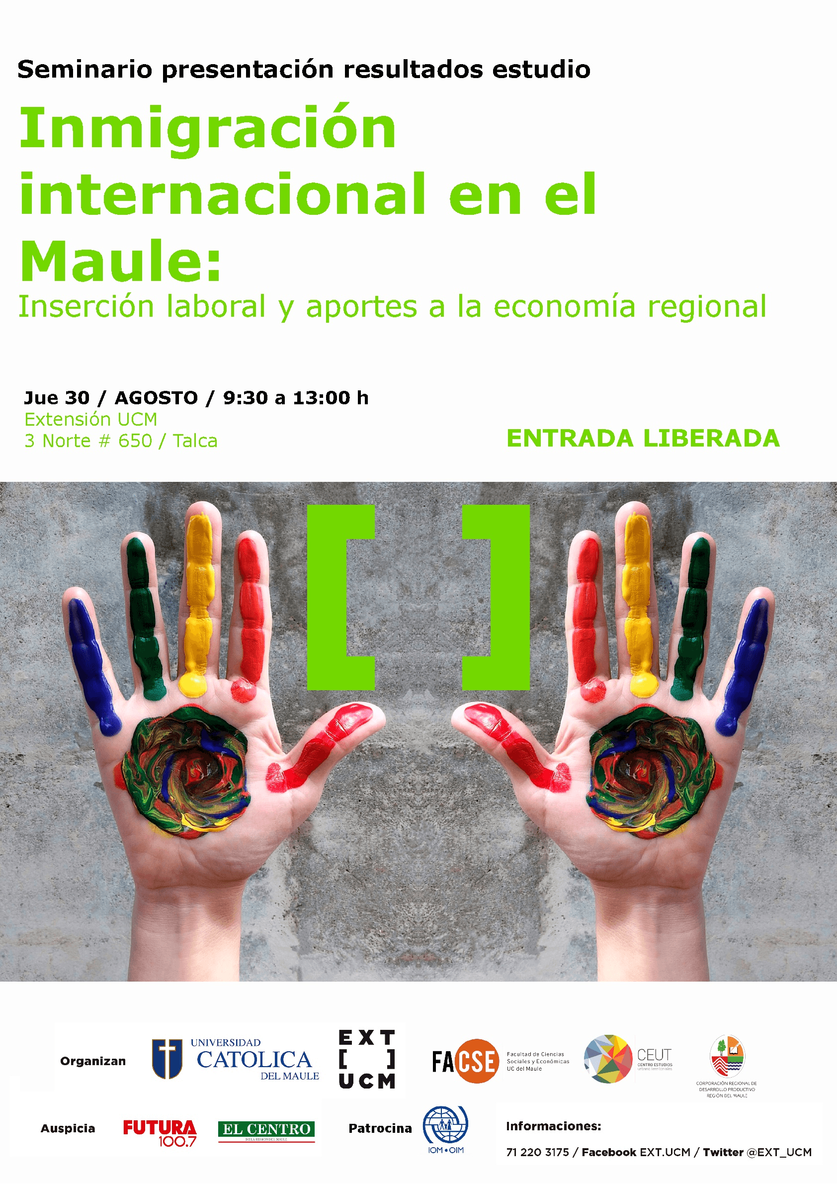 Este jueves 30 de agosto, de 09:30 a 13:00 horas en el Centro de Extensión de la UCM en Talca (calle 3 Norte #650), los investigadores del Centro de Estudios Urbano-Territoriales (Facultad de Ciencias Sociales y Económicas de la Universidad Católica del Maule), presentarán los resultados del estudio “Inmigración internacional en el Maule – Inserción laboral y aportes a la economía regional”.