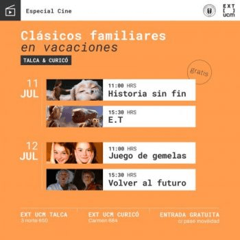 El próximo lunes 11 y martes 12 de julio, Extensión UCM Talca y Curicó invita al público maulino a disfrutar de su programación especial por vacaciones de invierno, que incluye la exhibición de las aclamadas películas “Historia Sin Fin”, “E.T”, “Juego de Gemelas” y “Volver al Futuro”.