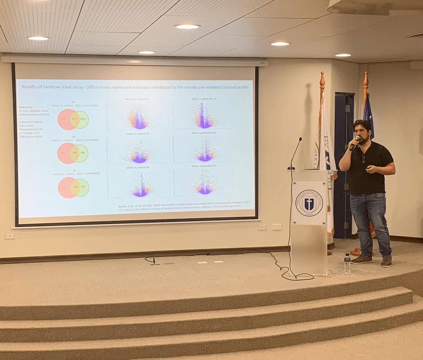En segundo lugar, el académico de la Facultad, Dr. Jorge Aedo, presentó el tema “Bases moleculares de la respuesta a estrés en teleósteos: Rol de la vía no canónica de acción del cortisol”.