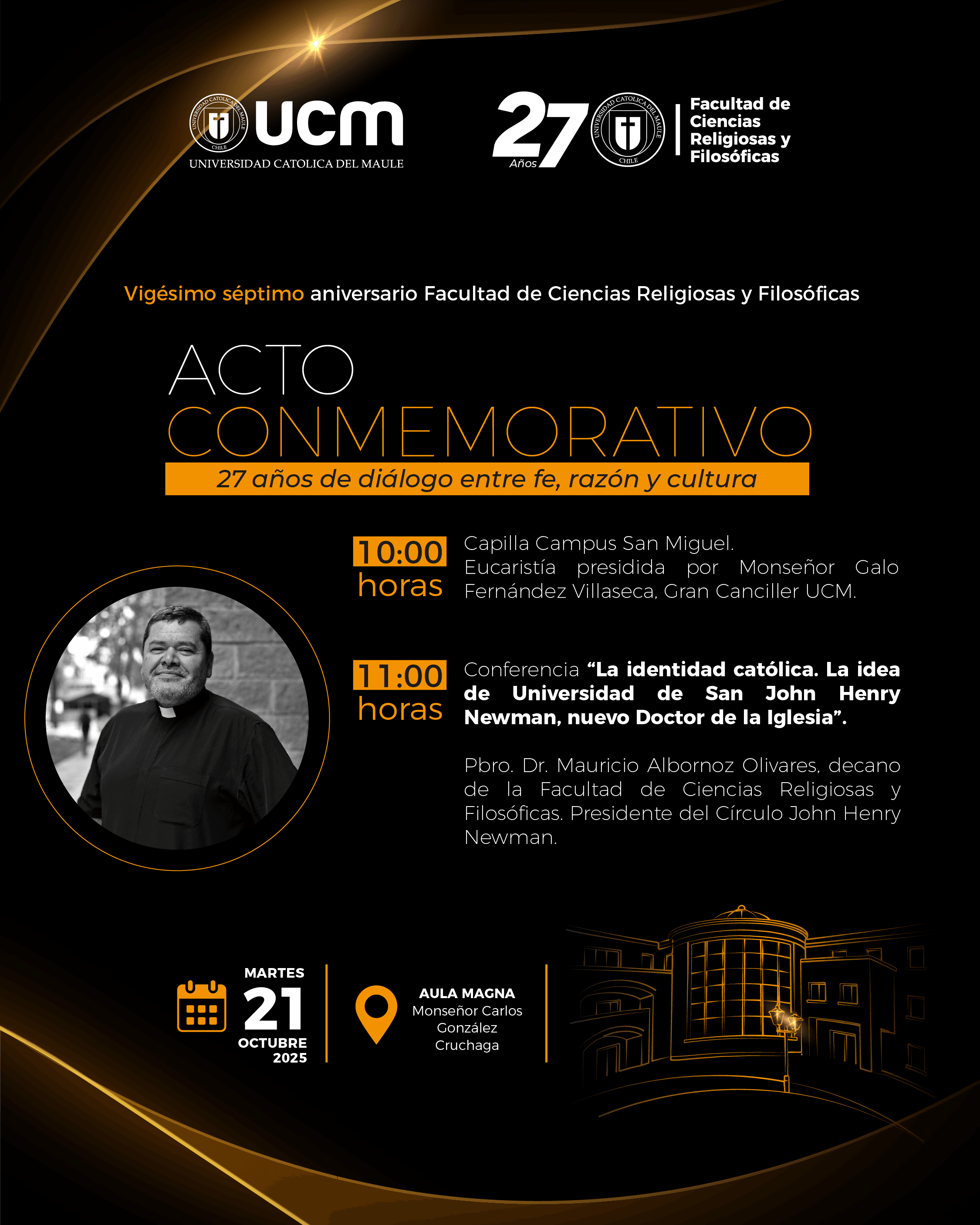 La Universidad Católica del Maule (UCM) invita a la comunidad universitaria y regional a participar en la celebración del vigésimo séptimo aniversario de la Facultad de Ciencias Religiosas y Filosóficas, que se realizará el próximo martes 21 de octubre de 2025 en el Campus San Miguel.