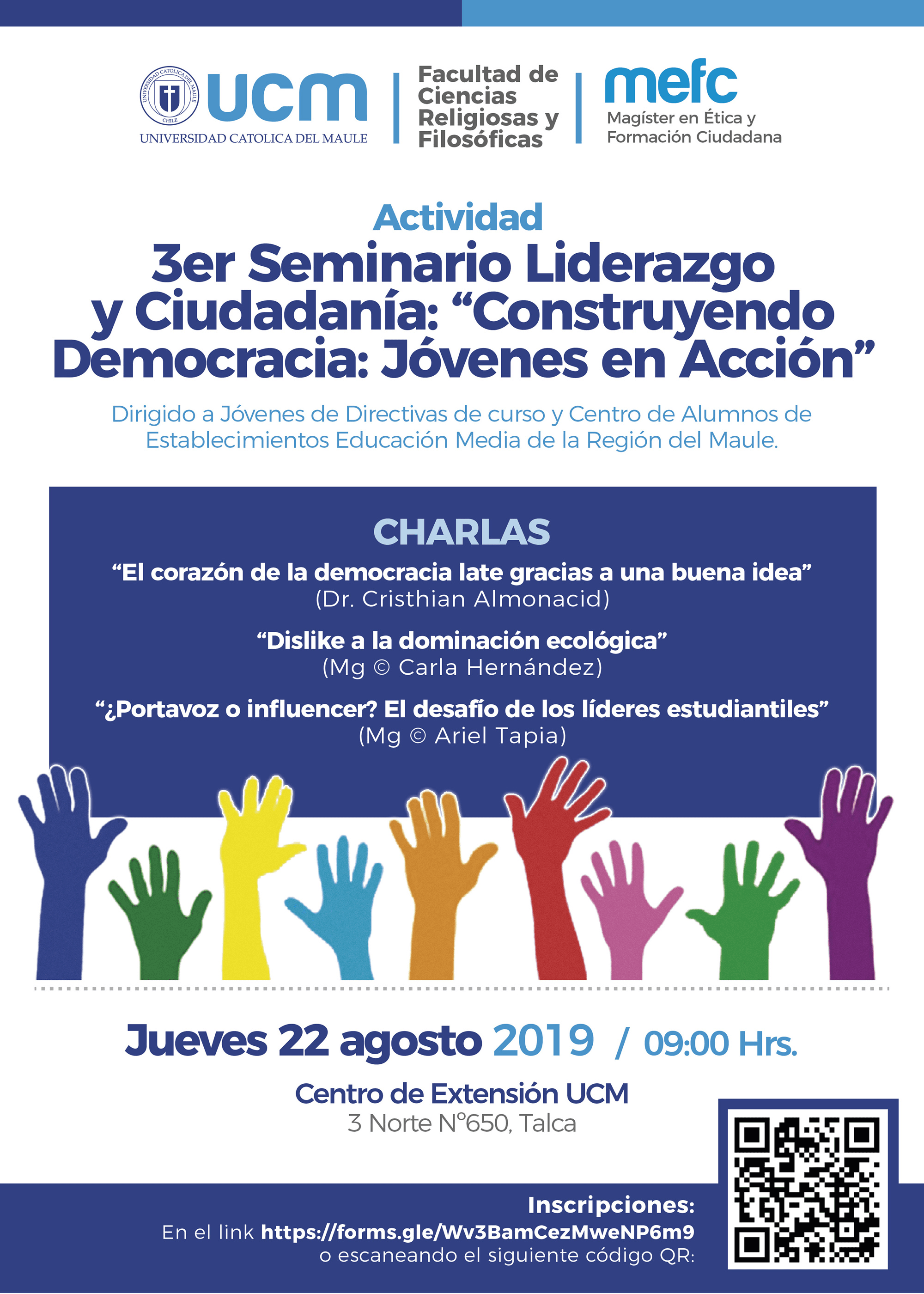“Construyendo democracia: Jóvenes en acción” se denomina el tercer seminario de “Liderazgo y Ciudadanía” que desarrolla el Magíster en Ética y Formación Ciudadana y del Área de Desarrollo “Ética y Sociedad” de la Facultad de Ciencias Religiosas y Filosóficas de la Universidad Católica del Maule, el cual convoca a académicos, estudiantes de postgrado y estudiantes del sistema escolar en torno a los desafíos de la sociedad actual.