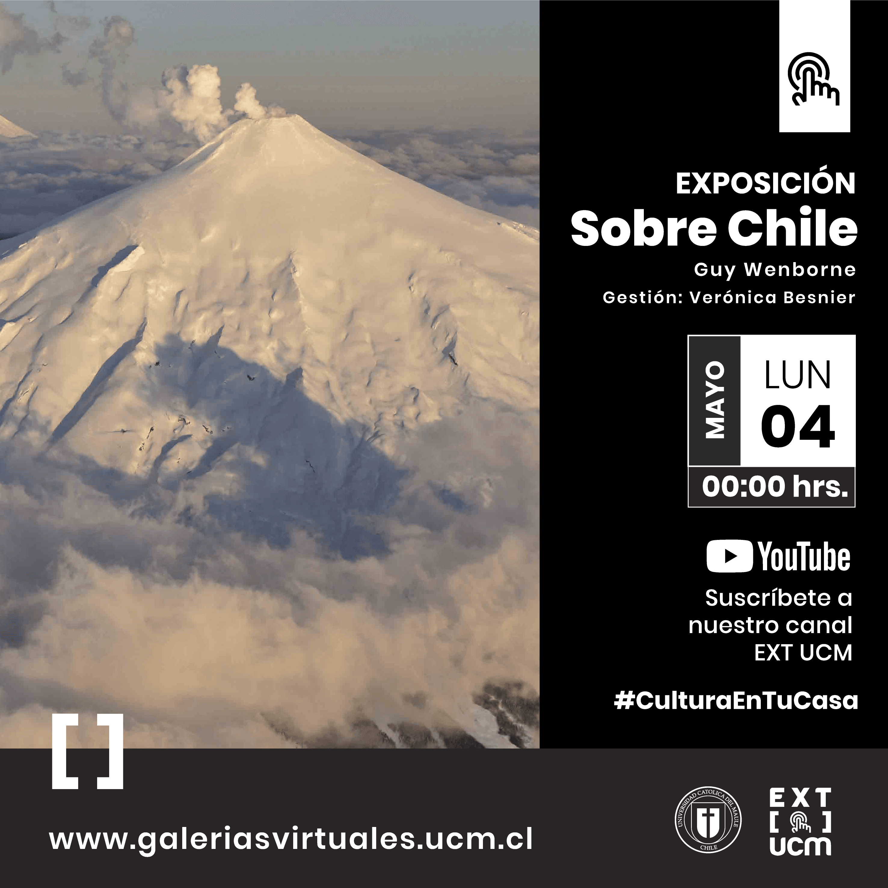 Este lunes 4 de mayo, se abre a la comunidad el sitio Galerías Virtuales (www.galeriasvirtuales.ucm.cl), una iniciativa de la Dirección de Extensión Cultural de la Universidad Católica del Maule (EXT UCM), que busca llevar a los hogares diversas muestras de arte, las cuales -hasta antes de la pandemia- se presentarían en su sala de exposiciones y que debido a la contingencia, formarán parte de su oferta online.