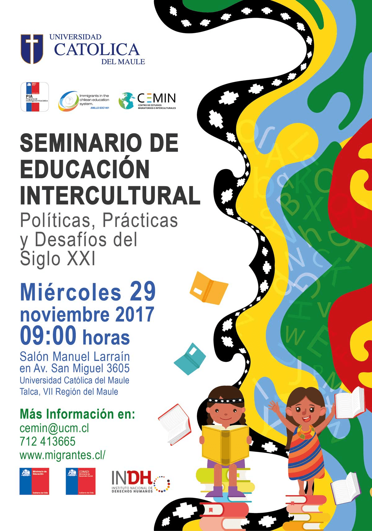 Bajo el título “Políticas, Prácticas y Desafíos del Siglo XXI” se realiza el miércoles 29 de noviembre a partir de las 09:00 horas en el salón Monseñor Manuel Larraín de la sede Central San Miguel de la Universidad Católica del Maule, el Seminario de Educación Intercultural organizado por el Centro de Estudios Migratorios e Interculturales (CEMIN) de la UCM, gracias al financiamiento del proyecto Anillo de Investigación en Ciencias Sociales de Conicyt.