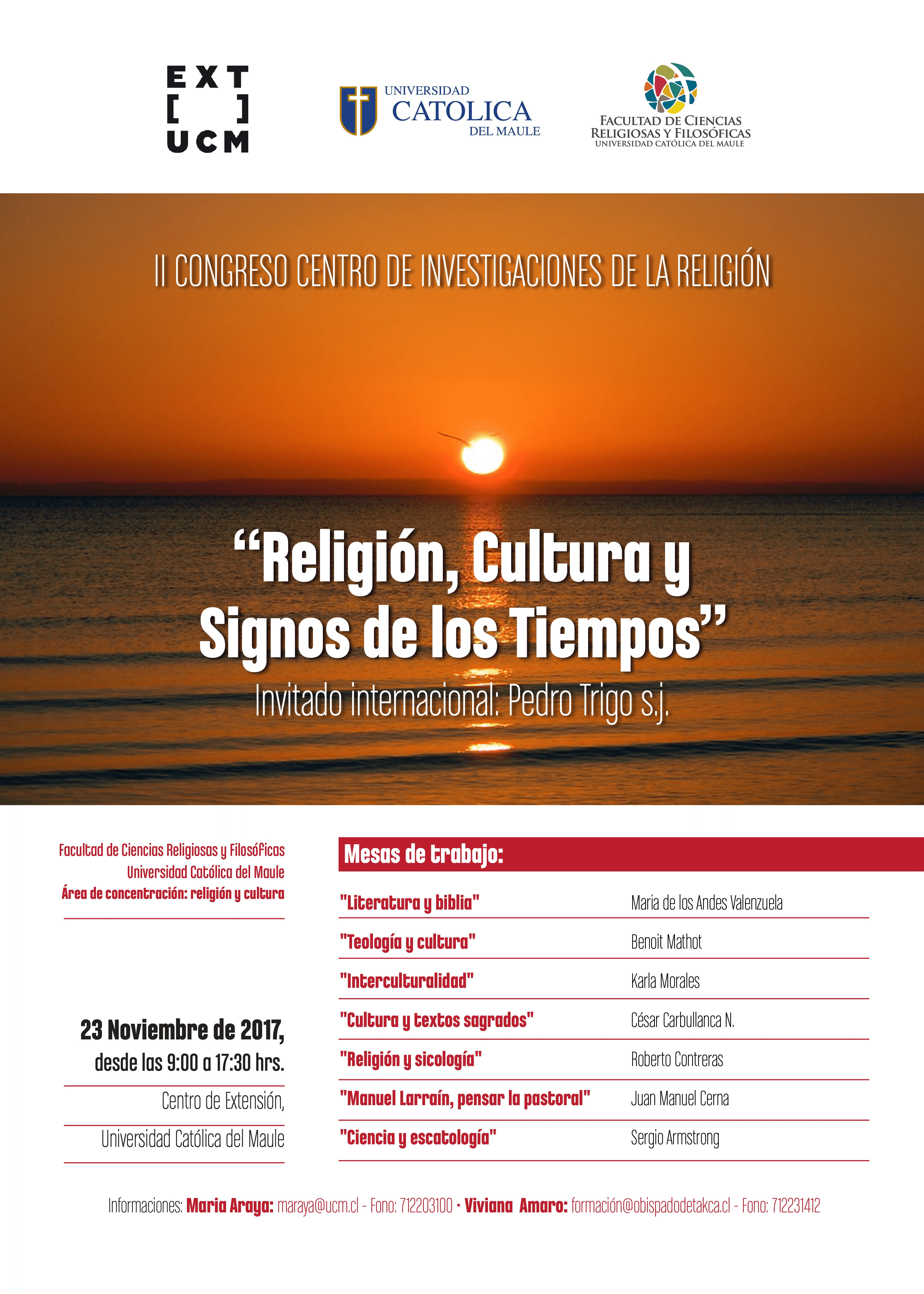 Con la participación del reconocido teólogo Pedro Trigo. 23 y 24 de noviembre en Talca El jueves 23 de noviembre del 2017, a las 9:30 horas, en el Centro de Extensión de la Universidad Católica del Maule, se realizará el II Congreso del Centro de Investigaciones de la Religión titulado "Religión, Cultura y Signos de los Tiempos", evento organizado por dicho Centro de la Facultad de Ciencias Religiosas y Filosóficas de la Universidad Católica del Maule, en conjunto a la Diócesis de Talca.
