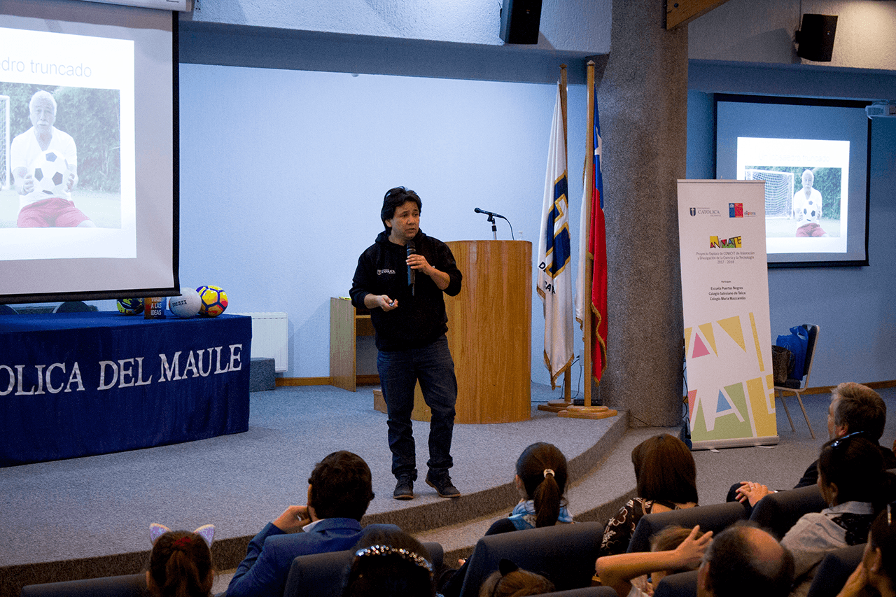 “Pelotas” fue la charla que el investigador matemático y presidente de la Sociedad Chilena de la Matemática, el Dr. Andrés Navas, presentó para dar inicio al proyecto que, precisamente, presenta conceptos matemáticos avanzados a través del análisis de las distintas pelotas deportivas que se han fabricado.