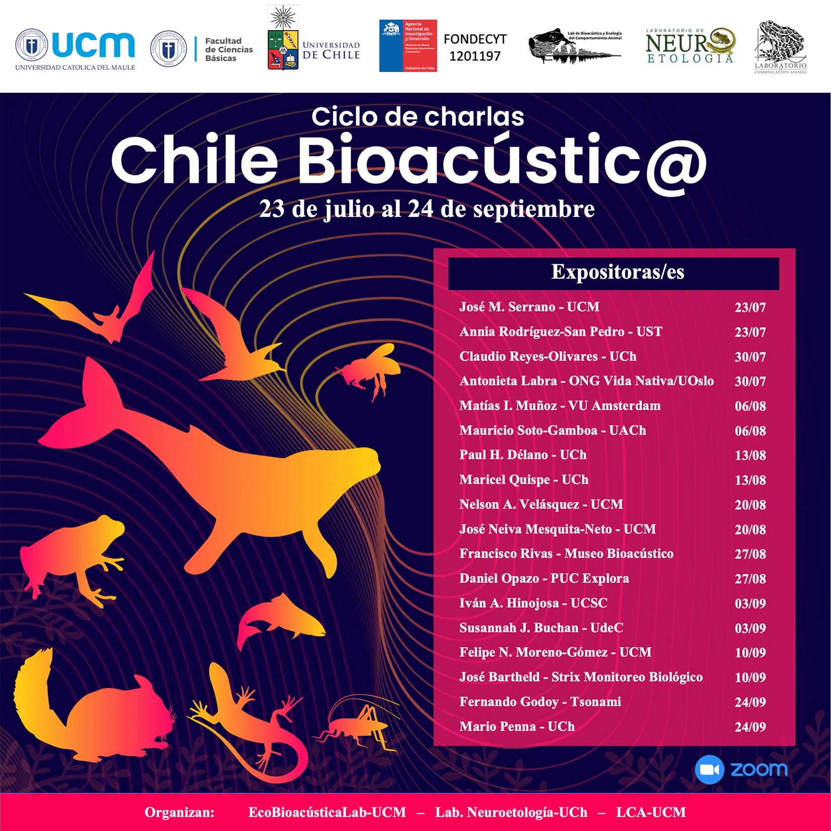 “El ciclo Chile Bioacústic@ comprende charlas sobre diversos ámbitos de la comunicación sonora en distintos animales. Las presentaciones están a cargo principalmente de científicos, y también de artistas y divulgadores”, comentó el Dr. Felipe Moreno Gómez, investigador del Laboratorio de Bioacústica y Ecología del Comportamiento Animal del Departamento de Biología y Química de la Facultad de Ciencias Básicas, quien junto al Dr. Nelson A. Velásquez, investigador de la UCM y al Dr. Mario Penna de la Facultad de Medicina de la U. de Chile dan vida a este interesante espacio.