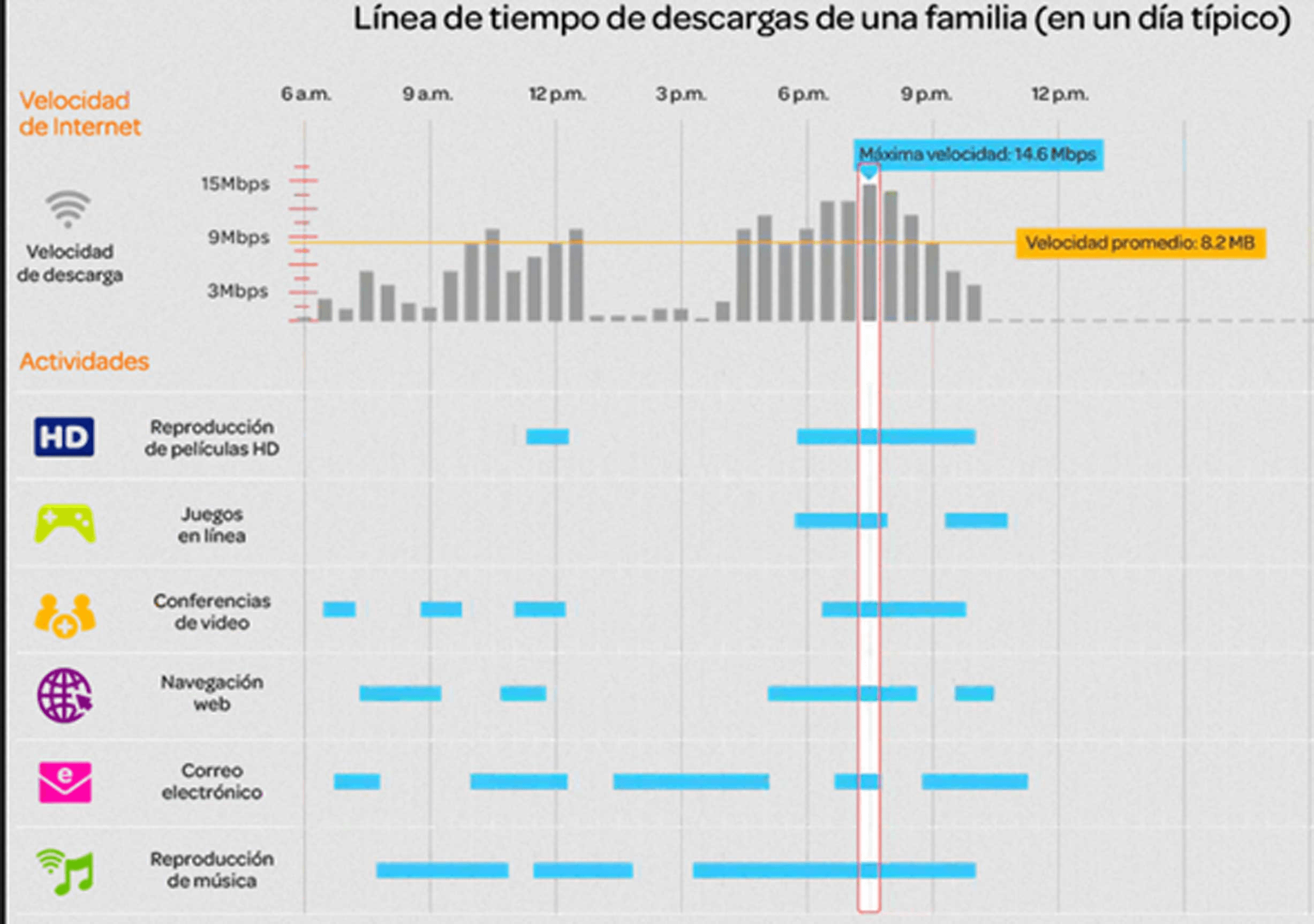 Un reciente estudio de AT&T determinó que una casa promedio de Estados Unidos, donde viven cinco personas que no están todo el tiempo en casa, en condiciones normales necesita un ancho de banda de 10 megabits por segundo y el horario de mayor uso es entre las 20 y las 22 horas. “En el contexto de pandemia tomando en cuenta que las cinco personas están en casa y se trabaja, se estudia y recrea en casa con servicios de streaming, esos promedios se han visto incrementado hasta en cinco veces, o sea, necesita 50 megabits por segundo”, afirmó el académico de la UCM.