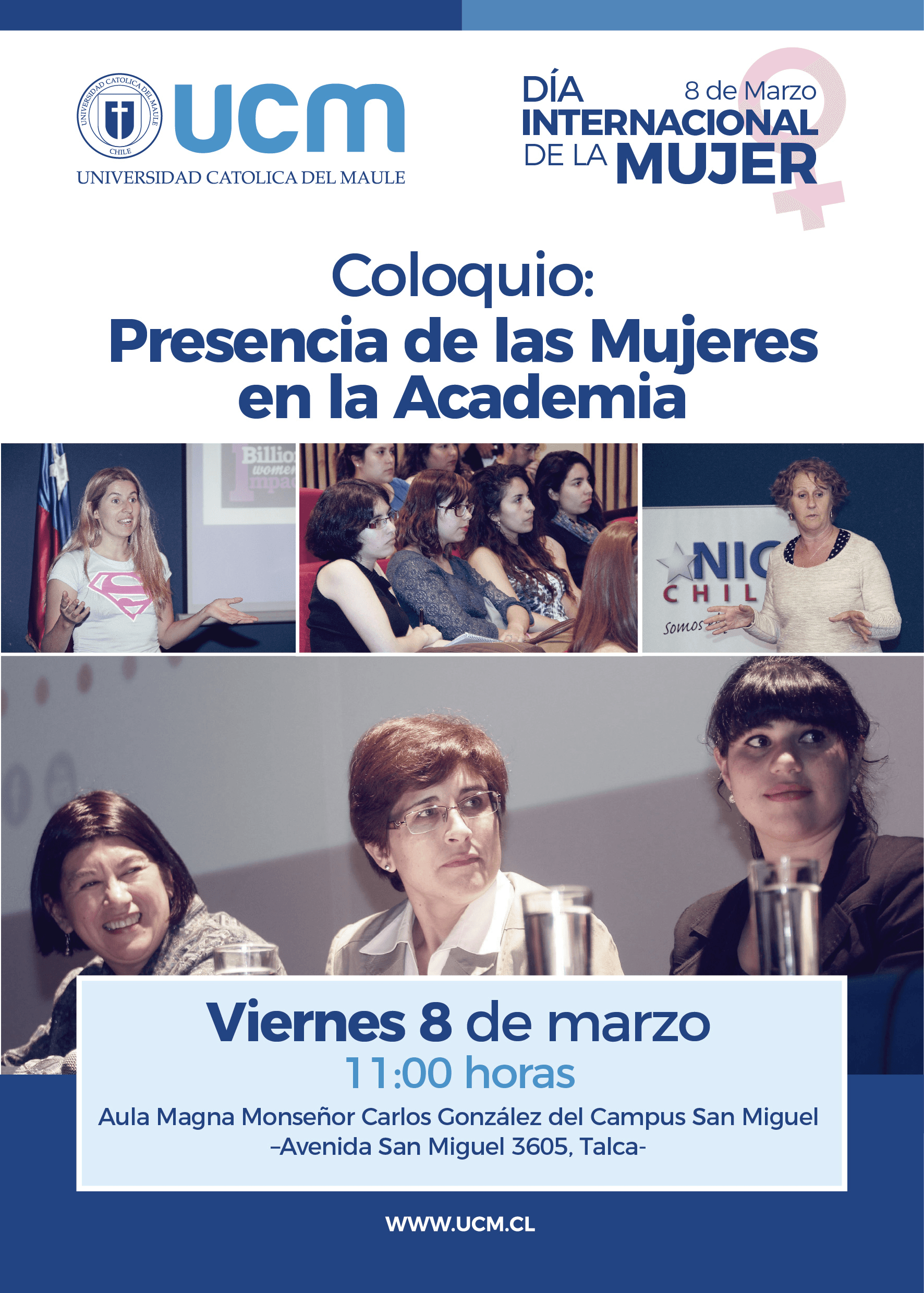 Con el fin de visualizar el aporte que han realizado las mujeres en el desarrollo de la ciencia y la academia, en el marco de la conmemoración del Día Internacional de la Mujer, es que la Universidad Católica del Maule invita a la comunidad a participar del Coloquio “Presencia de las Mujeres en la Academia”, actividad que se llevará a cabo el viernes 8 de marzo a las 11:00 horas en el Aula Magna Monseñor Carlos González del Campus San Miguel en Talca.
