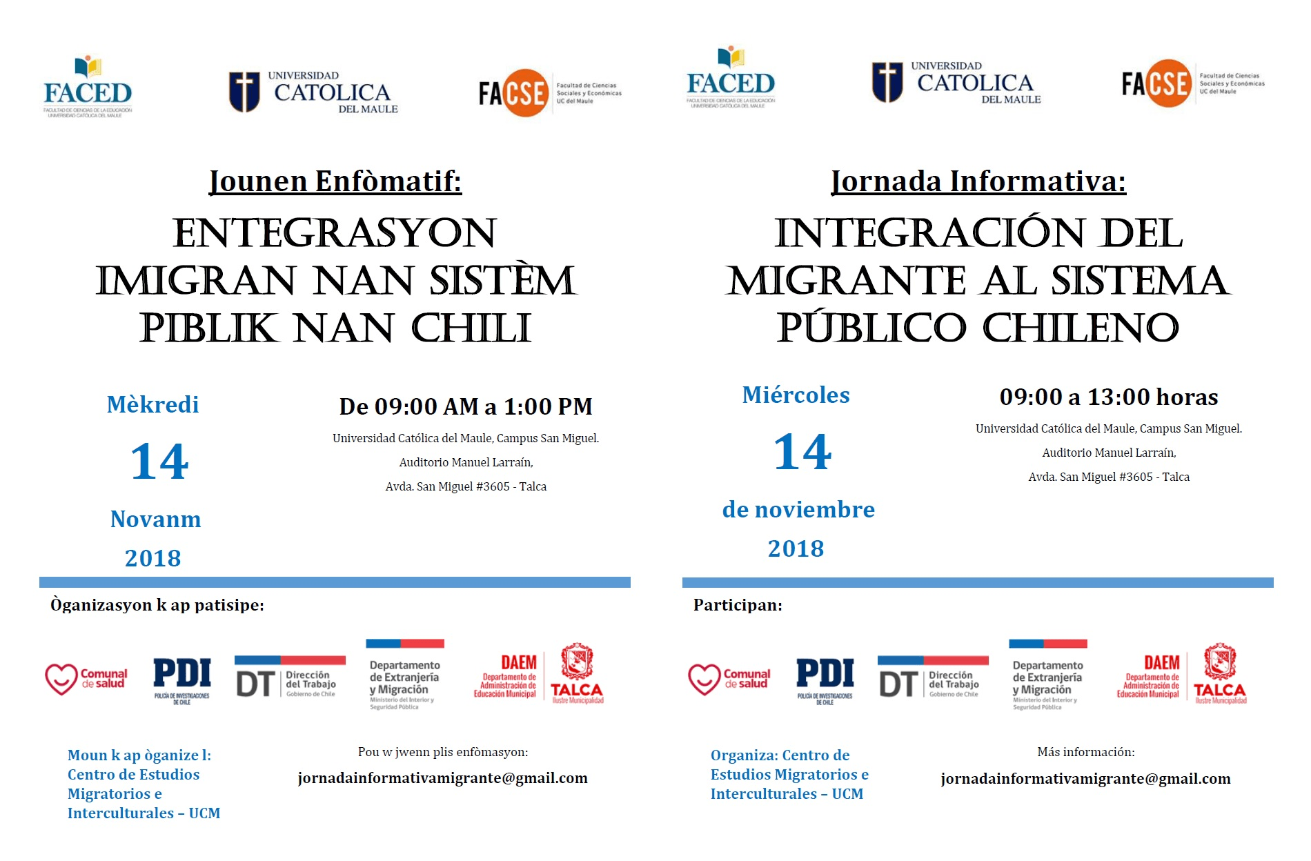A través de la alianza que tiene el Centro de Estudios Migratorios e Interculturales con distintas instituciones como por ejemplo: la Dirección Comunal de Salud de Talca, DAEM, el Departamento de Extranjería, Dirección del Trabajo y la PDI Talca, se realizará esta jornada informativa que irá en directo beneficio de la población migrante, de tal forma de aportar a su integración en nuestra sociedad.