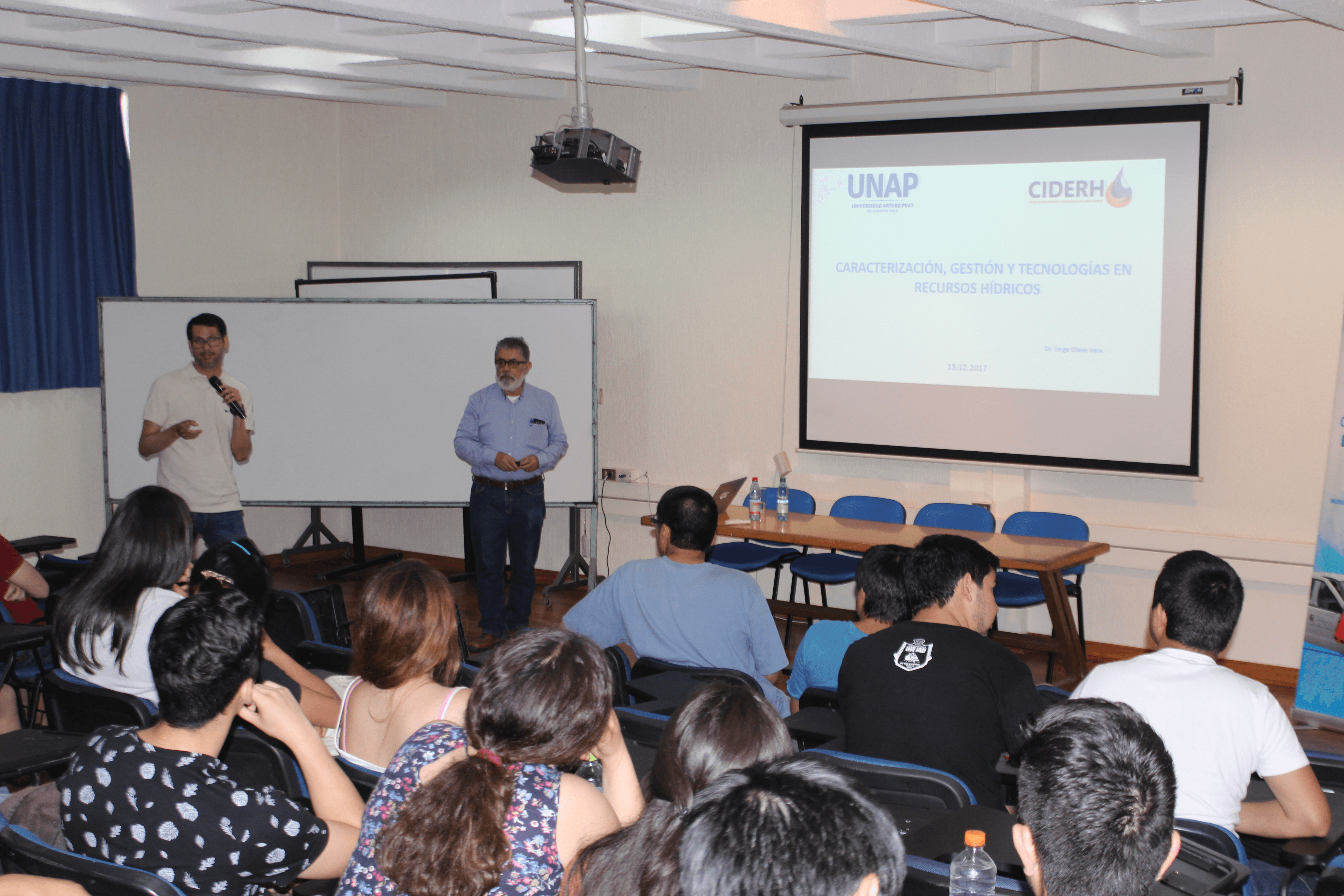 Futuros ingenieros y estudiantes del Magíster en Construcción Sustentable de la Universidad Católica del Maule (UCM), pudieron profundizar sus conocimientos en un ámbito trascendental en la actualidad, como lo es la gestión y optimización del recurso hídrico, teniendo en cuenta el cambio climático. Lo anterior, sin duda incide en la oferta de agua, afectando a los ecosistemas y la agricultura, pudiendo observar a futuro cambios en la calidad del agua de los ríos, lagos, humedales, entre otros. “Tarapacá: Caracterización, Gestión y Tecnologías en Recursos Hídricos”, fue el nombre de la ponencia que dictó el Dr. Jorge Olave en la UCM, quien actualmente es director del Centro de Investigación y Desarrollo en Recursos Hídricos (CIDERH) de la Universidad Arturo Prat en Iquique. Con respecto a la temática de aguas residuales, el Dr. Olave señaló que “es un tema común a todo el país y así está definido en la agenda nacional de recursos hídricos, lo que se refiere a diversificación, uso eficiente de aguas, en las diferentes actividades económicas, la incorporación de tecnología de la información, aspectos de desarrollo territorial, entre otros”, dijo. El CIDERH nace el 2010 impulsado por la Comisión Nacional de Investigación Científica y Tecnológica (Conicyt) que, a través de la creación de centros de investigación regionales, busca promover e instalar capacidades de investigación y formación de masa crítica a nivel regional en disciplinas o materias específicas, para que se conviertan en referentes nacionales en el área temática de su competencia. “Vengo de una zona donde ya el paisaje es diferente y la escases del recurso hídrico es el factor dominante, entonces hay temas que son de carácter general y otros más específicos, como, por ejemplo, nosotros estamos desarrollando la idea de poder diversificar la matriz hídrica de tal manera que se haga un uso más intensivo de las aguas residuales y de mar desalinizada para diferentes usos, ya sea incluso como agua potable para la población, como está ocurriendo en Antofagasta”, explicó.