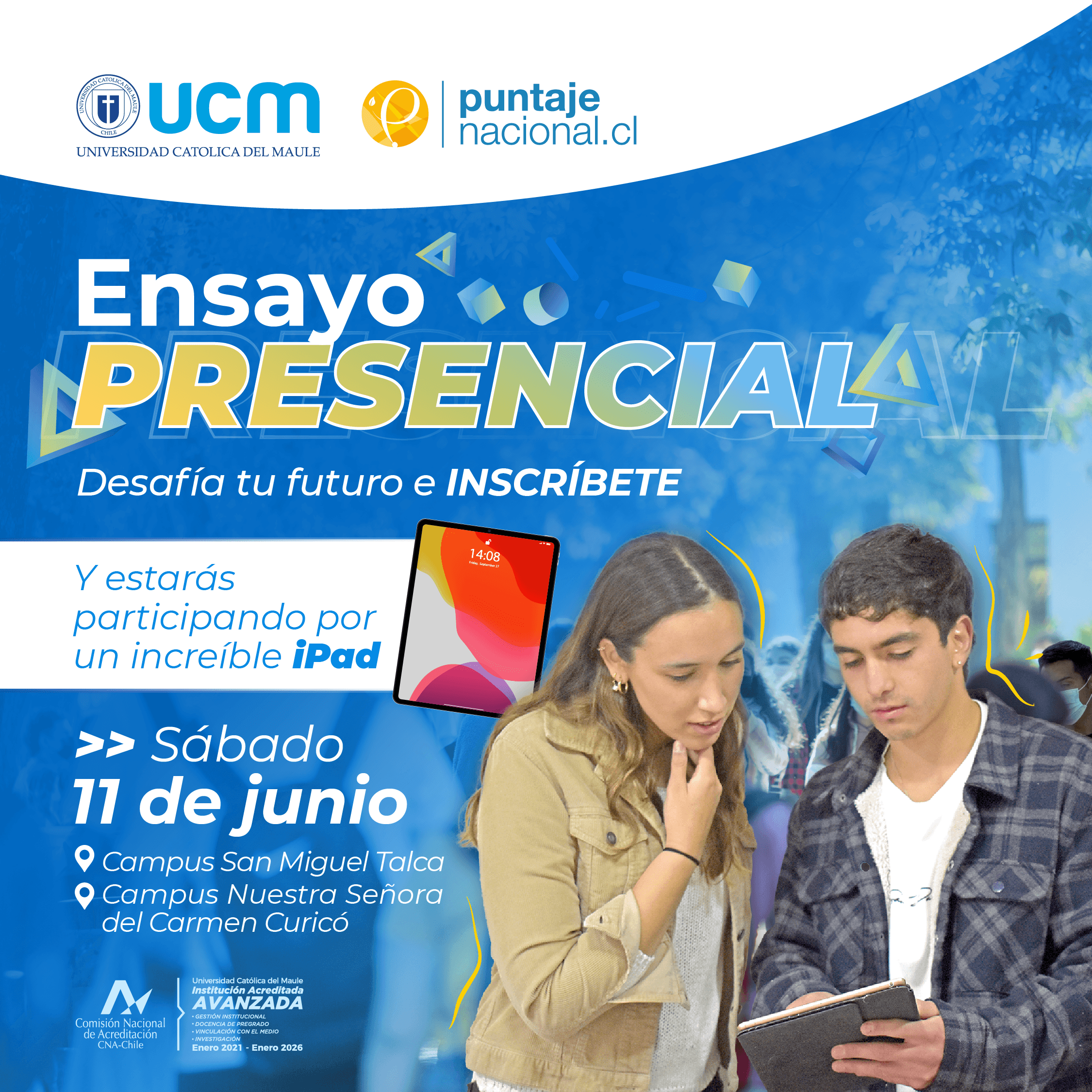 Finalmente, el próximo sábado 11 de junio, la Universidad Católica del Maule, realizará un ensayo presencial y gratuito para alumnos egresados de cuarto medio, en las sedes de Talca y Curicó, instancia para que los aspirantes a universitarios, puedan medir sus conocimientos y ver qué tan preparados se encuentran para rendir la PDT de invierno, o la PAES a final del año. La ficha de inscripción está disponible en el sitio www.prenovato.ucm.cl.