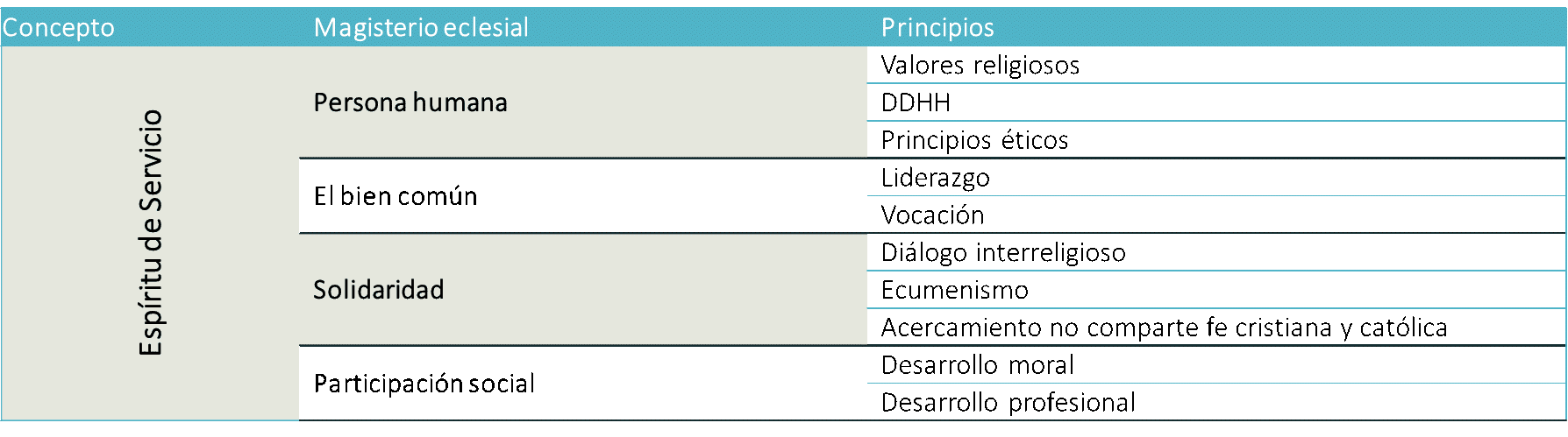 El constructo Espíritu de Servicio, su marco regulador lo da la enseñanza social cristiana, comprendida esta no solo en un concepto dado y perfectamente acotado, sino a lo largo de todo el proceso de la evolución histórica de la enseñanza social de tradición católica, o lo que se entiende comúnmente como Enseñanza social de la Iglesia. A partir de diversos documentos magisteriales, se reconocen elementos que son coherentes con nuestra Misión y nuestro PDE Institucional, orientando y definiendo el significado y marco teórico en donde el espíritu de servicio toma cuerpo.