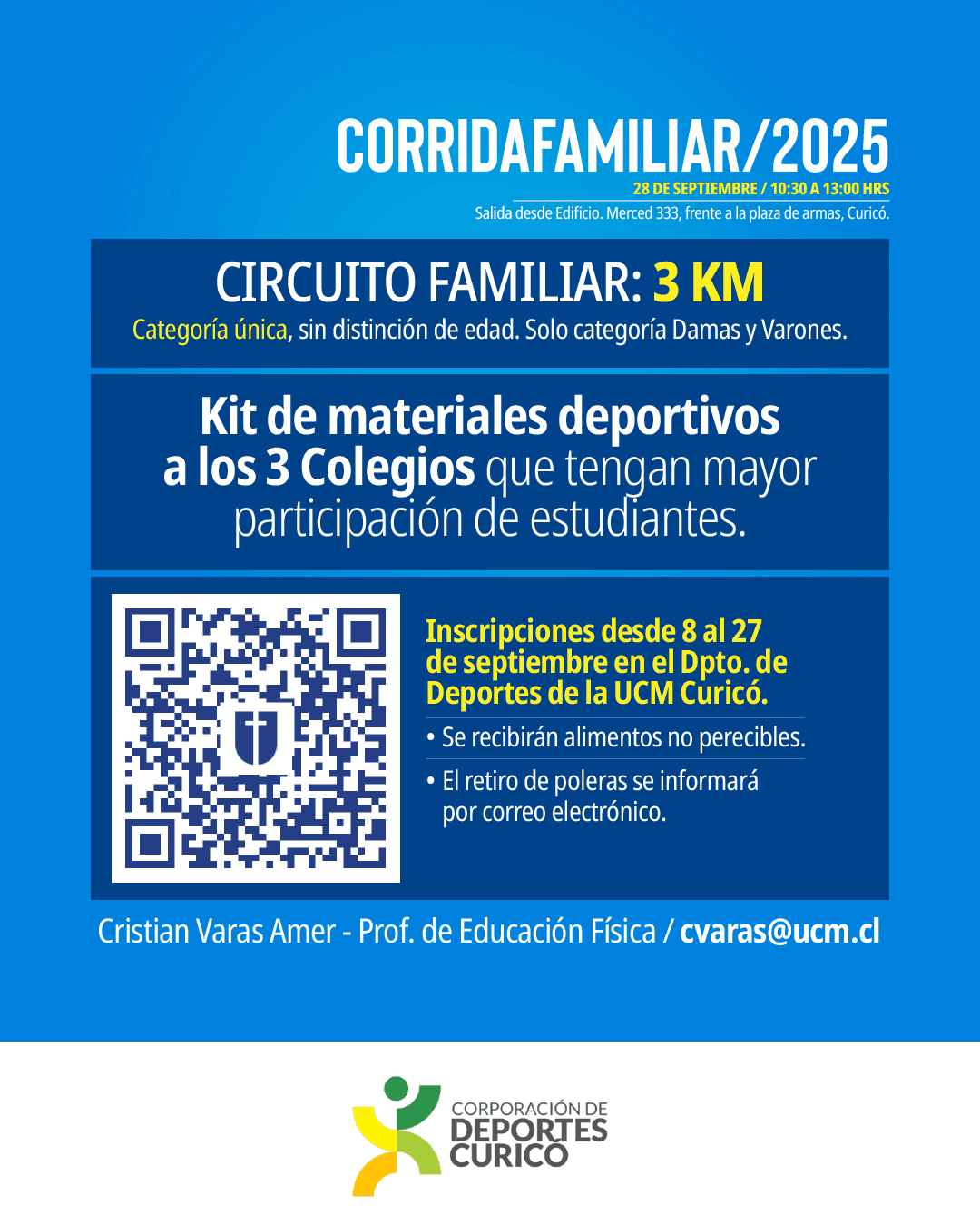 La Universidad Católica del Maule (UCM), con el apoyo de la Corporación de Deportes de Curicó, invita a toda la comunidad a sumarse a la Corrida Familiar UCM 2025, que tendrá lugar este domingo 28 de septiembre, entre las 10:30 y 13:00 horas, en la Plaza de Armas de la ciudad.