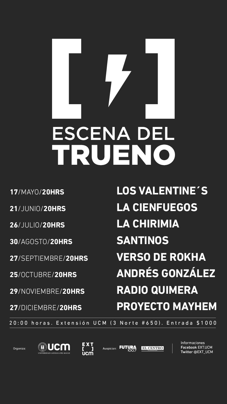 Desde el año pasado, la Universidad Católica del Maule (UCM) a través de su Dirección de Extensión, Arte y Cultura (EXT UCM) realiza el ciclo “Escena del Trueno”, espacio que reúne a bandas emergentes de la Región del Maule, que están dando que hablar.