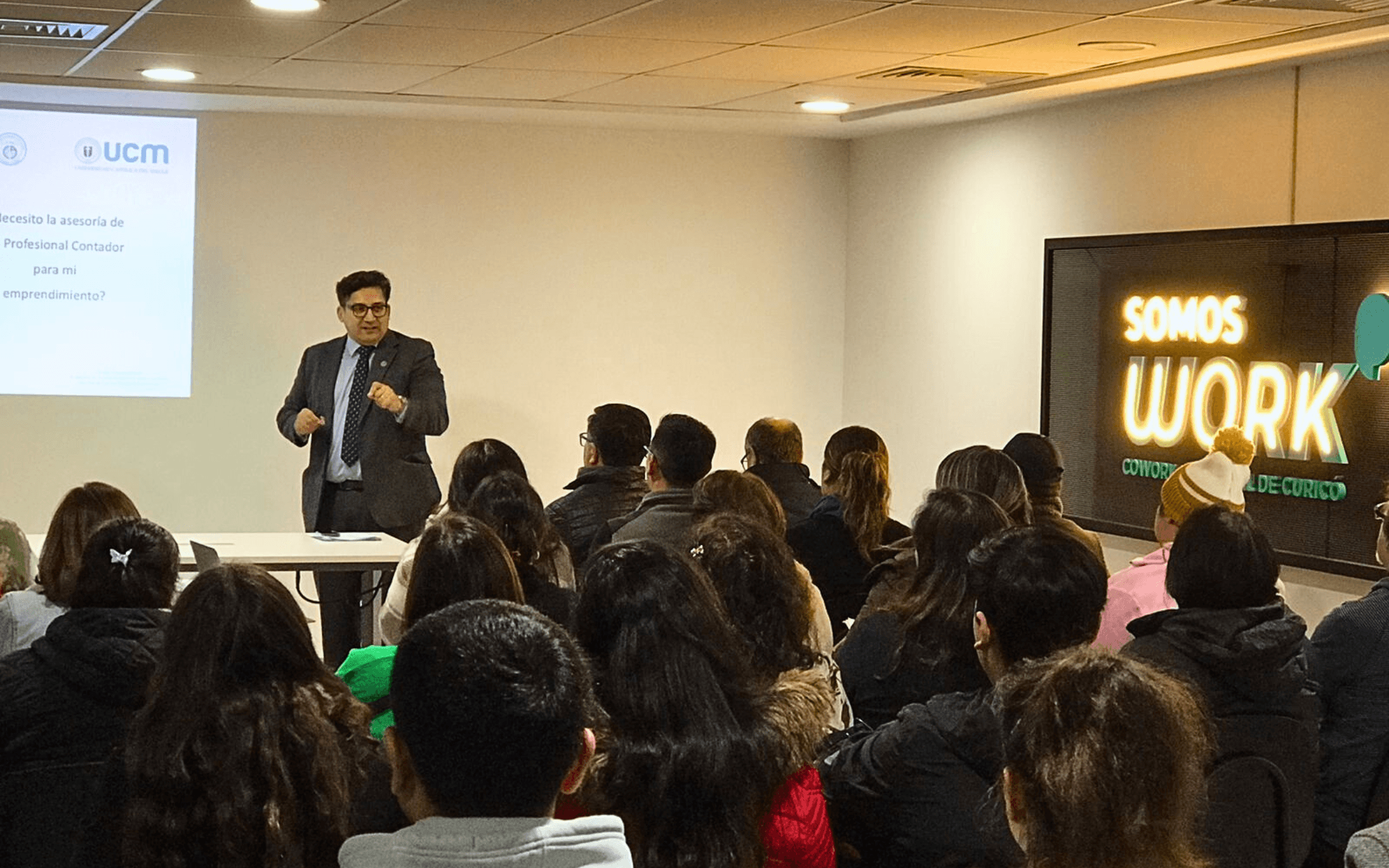 Con una activa participación de emprendedoras y emprendedores de la provincia de Curicó, se desarrolló el seminario “Declaración de IVA para emprendedores”. El encuentro se realizó en la sala cowork de la Clínica Tributaria “Somos Pro” (ubicada en Carmen #560), espacio impulsado por la Universidad Católica del Maule (UCM) y la Corporación Municipal de Fomento Productivo de Curicó.