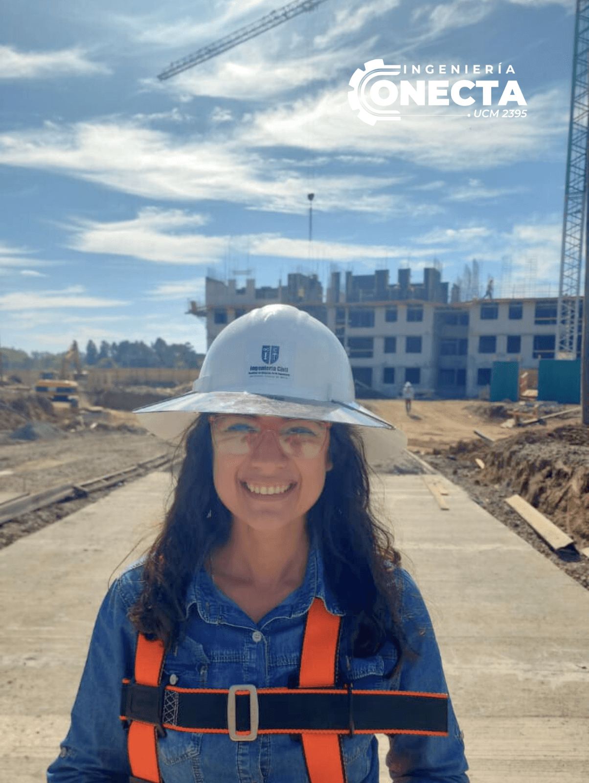 Durante su primer mes de práctica, Margarita trabajó en el Departamento de Calidad. Aunque los conocimientos teóricos sobre procesos constructivos los tenía claros, verlos ejecutados fue un desafío que le permitió aprender de manera más profunda. Un ejemplo de esto fue ver "cómo logran que un muro de hormigón armado tenga su enfierradura derecha, uno piensa que por inercia queda centrada en el eje y debe tener necesariamente unos trozos de madera en forma triangular que se ponen en la parte superior, a cada lado, así estos la guían. Y como esto hay muchas más consideraciones que nosotros como alumnos no sabemos y son fundamentales para asegurar la calidad", explicó la estudiante. Actualmente, Margarita se encuentra en la Oficina Técnica, realizando tareas que involucran la cubicación de materiales, recopilación de información y el registro de las obras mediante fotografías que muestren el avance de estas. Además, asistió a reuniones semanales last planner y participó en la programación a detalle de losas y muros, lo que le ha permitido comprender la importancia de la planificación y la organización. Superando barreras: la experiencia de ser mujer en Ingeniería civil Uno de los aspectos más destacados de la entrevista es su reflexión sobre los desafíos que enfrenta como mujer en un campo predominantemente masculino. En sus primeras semanas, Margarita se sintió algo invisible, especialmente en el terreno de la construcción, donde no siempre recibía el mismo trato que sus compañeros hombres. Comenta que, sin embargo, "al pasar de las semanas pude superar esta sensación, desarrollando más personalidad, y por iniciativa mía estirando la mano para ser saludada como a mis pares”, logrando desenvolverse con más confianza”. El impacto de la ingeniería en el entorno El deseo de Margarita de contribuir a la sociedad es claro. Para ella, la Ingeniería civil no es solo una carrera profesional, sino una herramienta para mejorar la calidad de vida de las personas. "Mi motivación más grande estudiando Ingeniería civil es poder tener la capacidad de crear un proyecto desde 0 y saber en todas las áreas que podemos contribuir a la sociedad, desde elevar una solicitud de factibilidad de agua potable, participar en proyectos sociales, hasta grandes proyectos como colaborar en la conexión del país mediante las carreteras. Todo esto provoca un impacto positivo en la calidad de vida de muchas personas a la vez y eso me parece un lindo sentimiento”, señala. Esta visión de la ingeniería como un medio para el bienestar social resalta el compromiso de las y los estudiantes de la UCM con el entorno en el que viven, alineándose con los objetivos que impulsa el proyecto Ingeniería Conecta. Crédito: Proyecto Ingeniería Conecta (UCM2395).