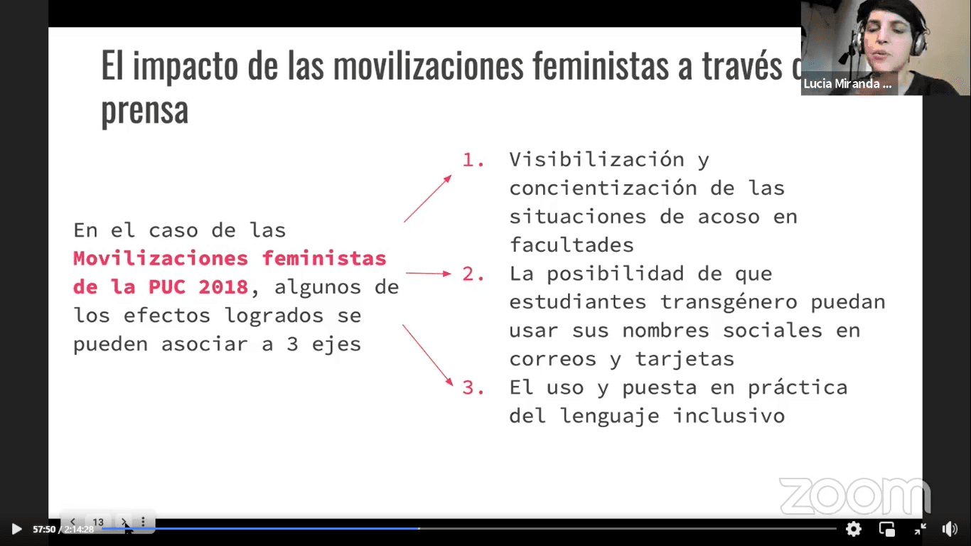 También participó de la instancia Lucía Miranda, académica que actualmente está realizando su investigación postdoctoral, financiada por ANID, en la Pontificia Universidad Católica, quien ha estudiado el movimiento estudiantil desde el ámbito del feminismo y su relación con las políticas públicas.
