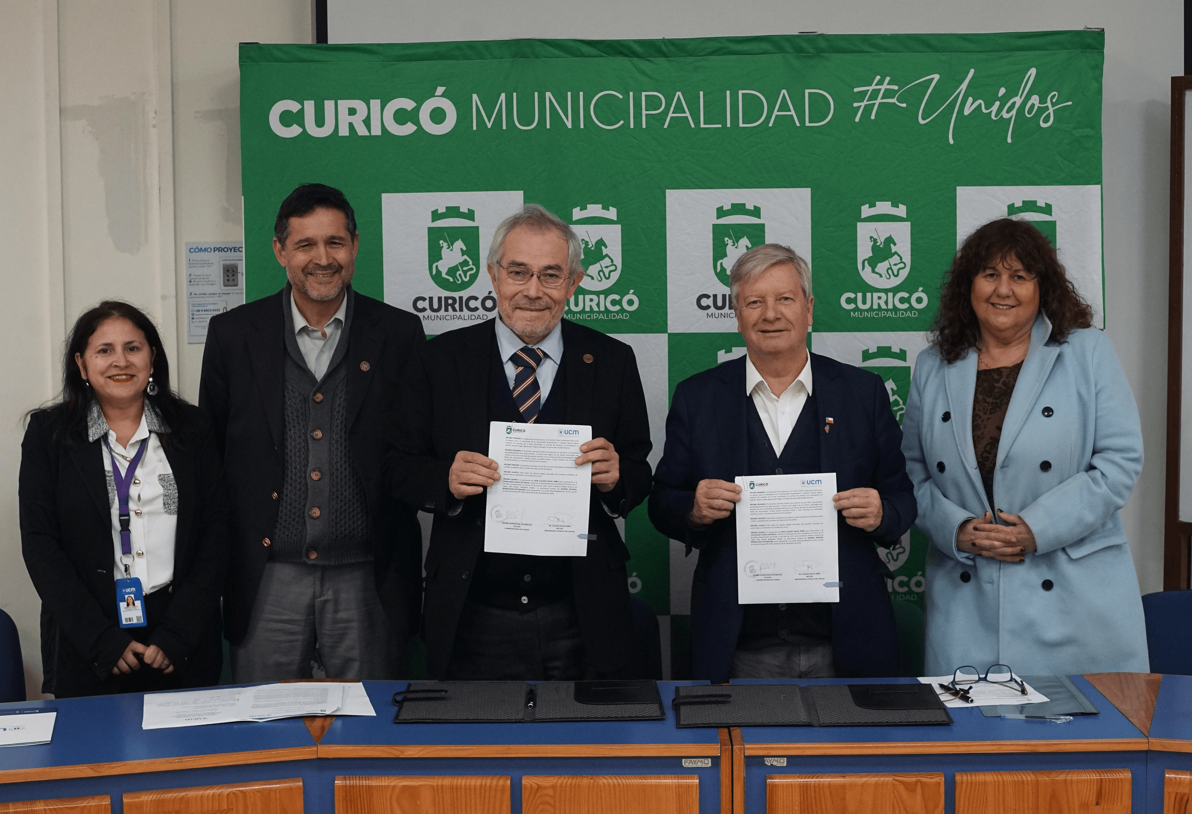 En dependencias de la UCM, campus San Isidro Labrador de Curicó, el alcalde George Bordachar junto a las autoridades académicas de dicha casa de estudios, encabezados por el rector, Dr. Claudio Rojas Miño, firmaron convenio de colaboración para que estudiantes de medicina veterinaria puedan realizar internados y práctica en el canil municipal.