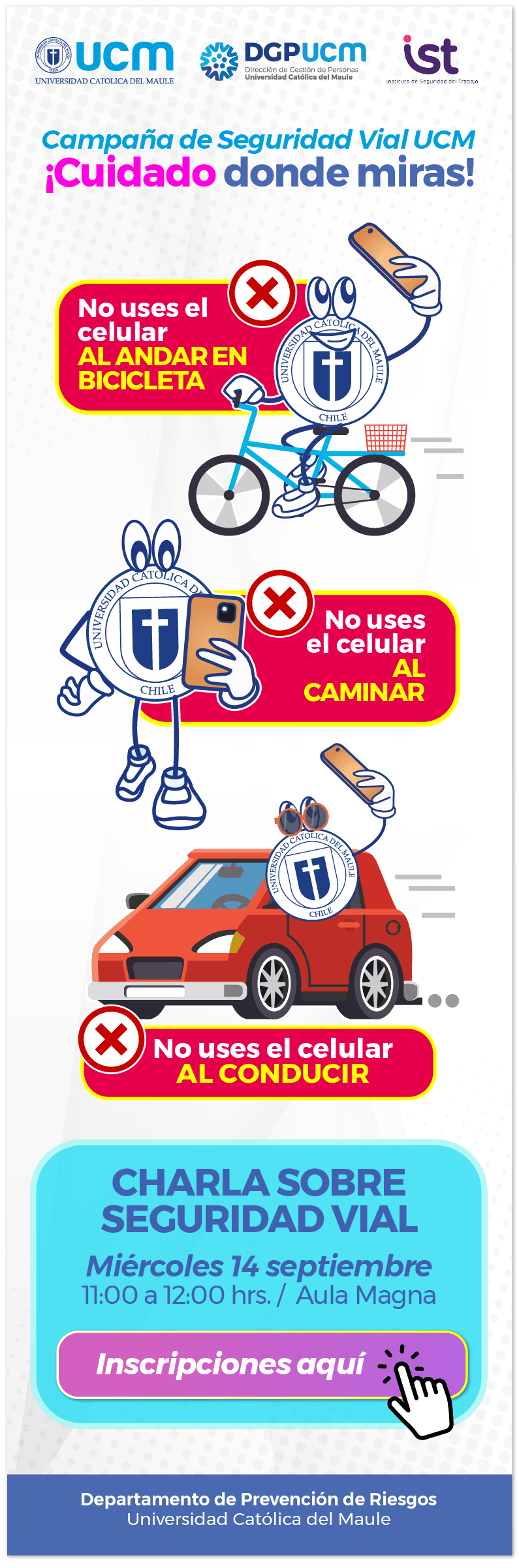 “En estas fechas de celebraciones, es de suma importancia la prevención y el autocuidado”, explicó el jefe del Departamento de Prevención de Riesgos de la UCM, José Luis Riquelme, quien luego agregó que en ella “se abordarán temas como, normativas, nuevas legislaciones, responsabilidad ante los accidentes, los cuidados al desplazarse como peatón, en vehículo o en bicicleta, estadísticas de accidente, entre otras”, comentó.